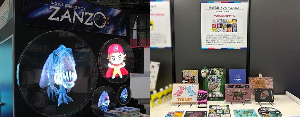 会場の特設コーナーでは、新たに恐竜デザインで作成した「KODAWARIシリーズ」も並び、インターコスモスの印刷・ラミネートの技術と表現力の幅広さを示す展示となりました。