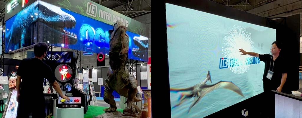 また、ボタンを押すと頭上の透過型「シースルービジョン」の映像が切り替わる「インコススイッチ」や、折り畳み式「パカットビジョン」の映像に触れると火花があがる「インコスタッチ」など、最新のビジョンとインタラクティブなシステムの組み合わせも、実際に触れて楽しめる体験型展示として好評でした。
