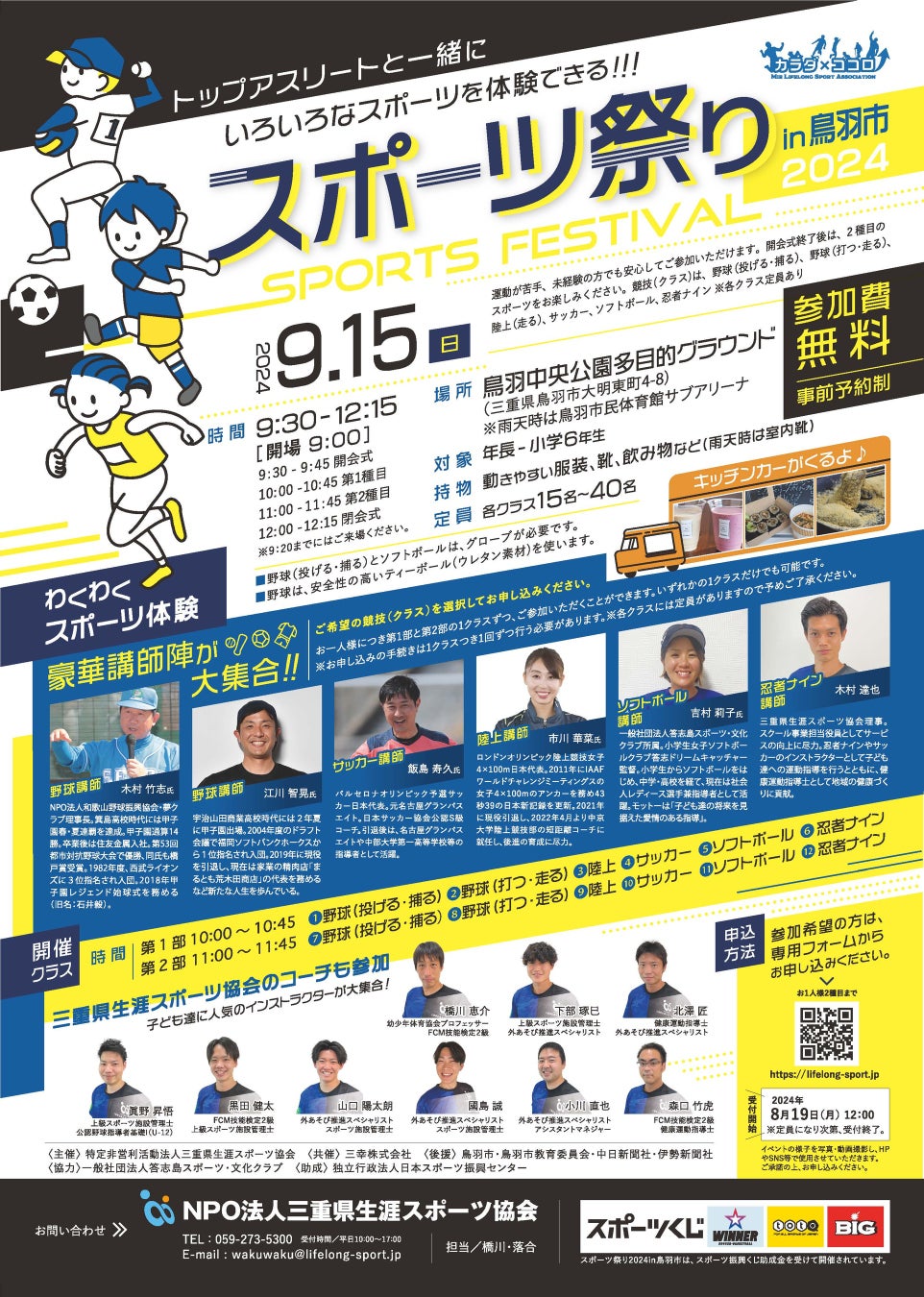 特定非営利活動法人三重県生涯スポーツ協会(三重県津市、理事長 竹田昌平)は、9月15日(日)に鳥羽市の鳥羽中央公園多目的グラウンドにて「スポーツ祭り2024in鳥羽市」を開催します。