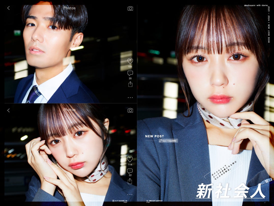 今回、来年の4月に新入学生、新社会人になる学生をサポートすべく、SNS総フォロワー数450万を誇る現役高校生さくらさんと、2022年に2000通を超える応募の中から選抜されたメンズノンノ専属モデルで二十歳の鈴々木響さんをフレッシャーズ向けイメージキャラクターに起用します。高校卒業から社会人になるまでの等身大のスーツスタイルがイメージできるよう、同世代モデルを起用しました。撮影を終えたお二人からは「(さくらさん)これから沢山スーツを着れる機会があればなあとワクワクです!」「(鈴々木さん)久々に着てみて、すごくしっくりする感覚を覚えました!」などのコメントをいただきました。さらに、これまでフレッシャーズ向けビジュアルに起用している”なえなの“さんにも4年連続で登場していただきます。