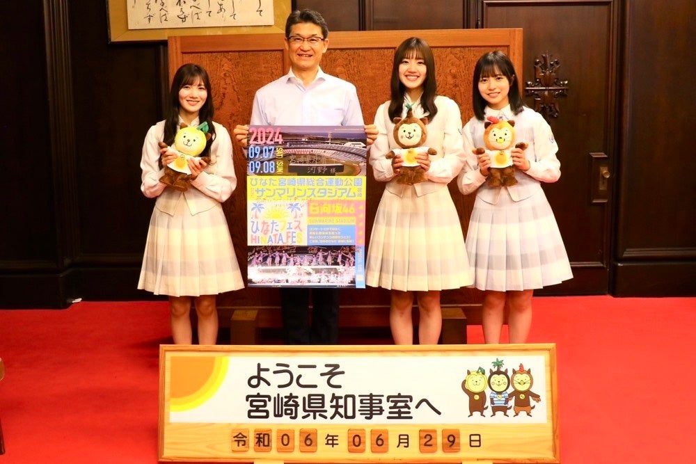 2019年に「日向坂46」に改名して以降、テレビ番組「日向坂で会いましょう」に宮崎県河野知事が出演するなど、「ひなた」のフレーズに共通点があることから、様々な接点を持たせていただくなか、今年9月には、“ひなた”サンマリンスタジアム宮崎をはじめとしたひなた宮崎県総合運動公園全体を使った「ひなたフェス2024」の開催が決定しました。