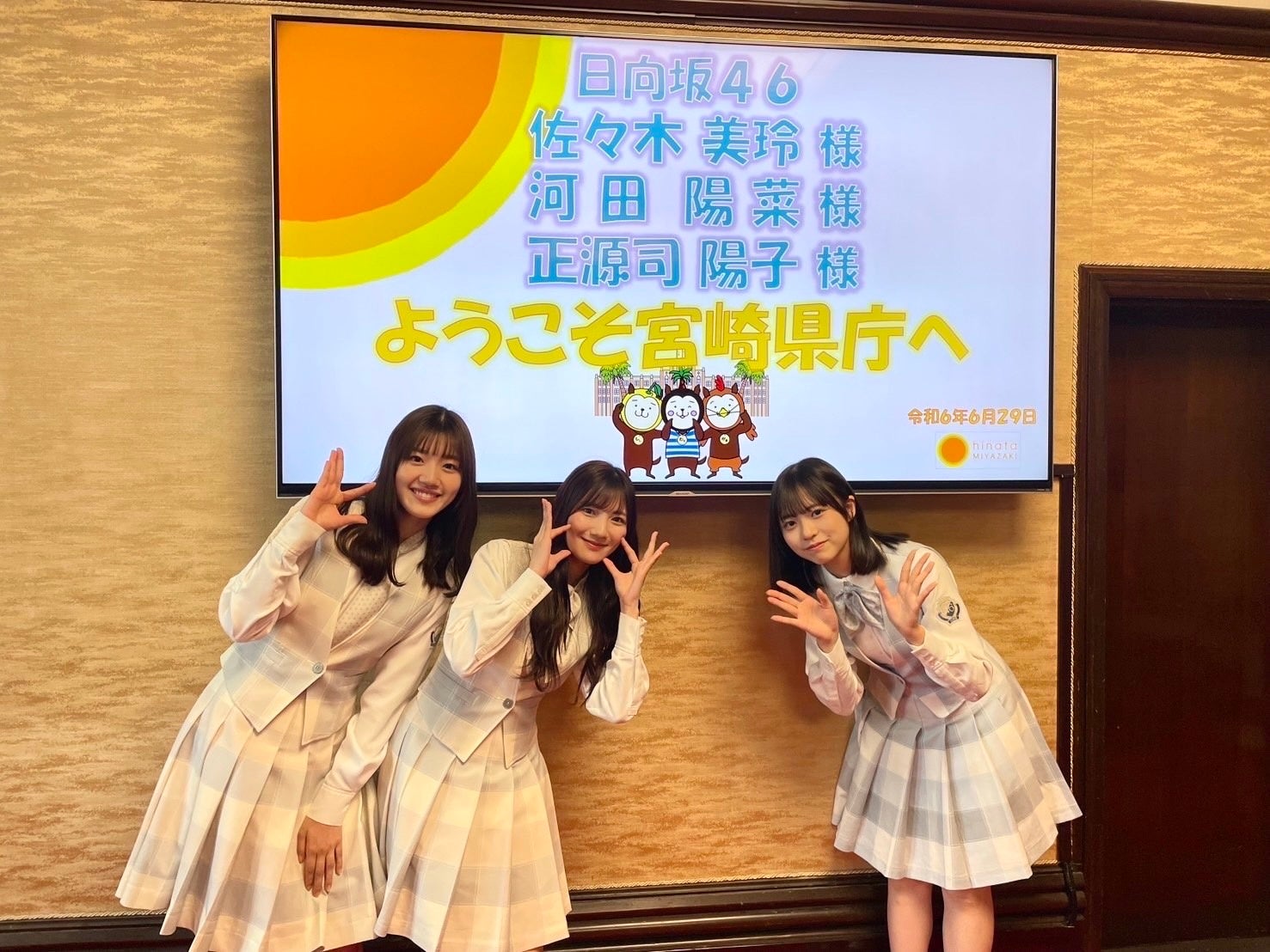 6月29日(土)には「ひなたフェス2024」を実施することのあいさつのため、日向坂46の佐々木美玲さん、河田陽菜さん、正源司陽子さんの3名が河野知事を表敬訪問しました。