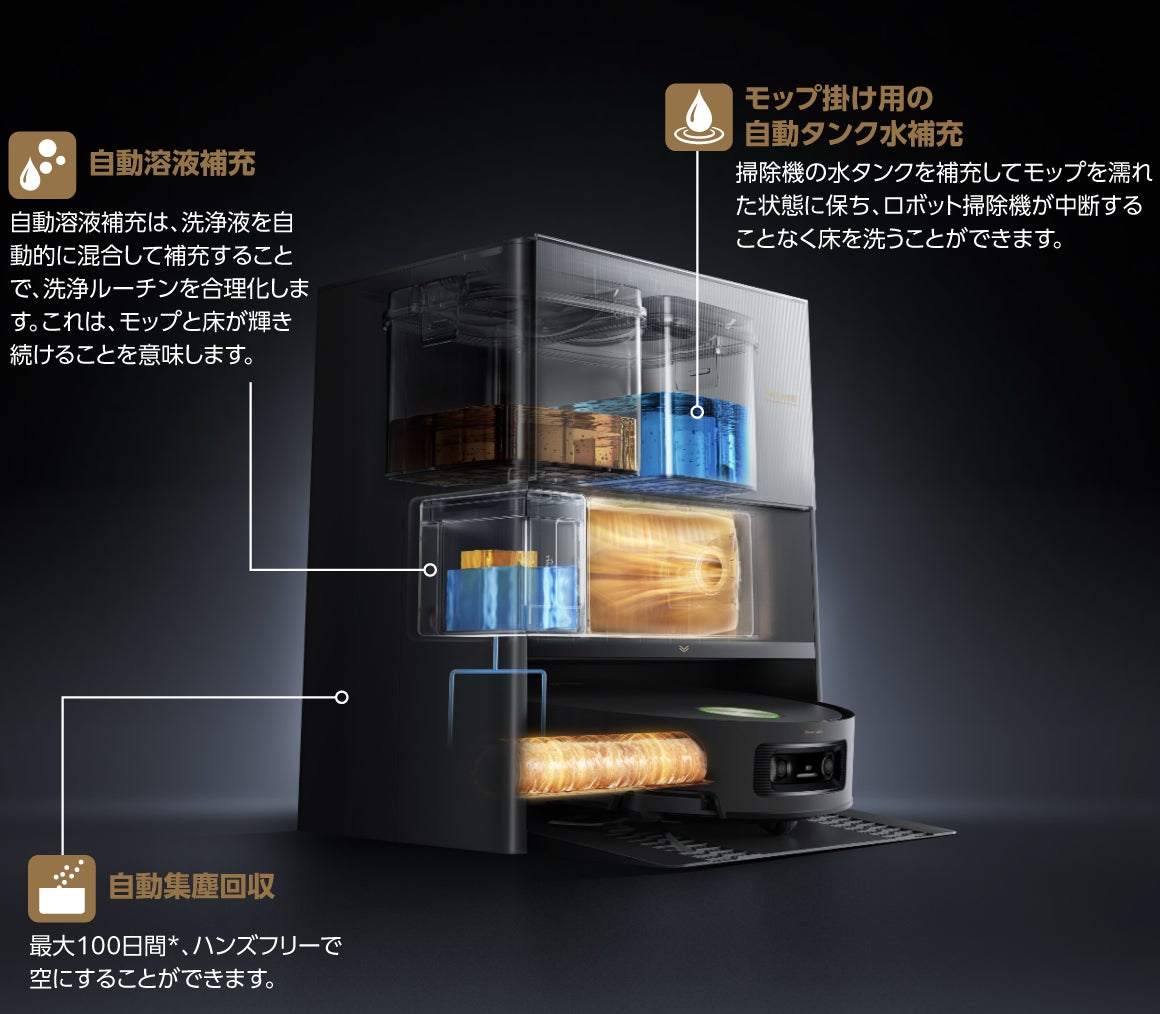 ・自動タンク水補充:掃除機の水タンク(浄水4L、汚水3.5L)を補充し、中断なく床を洗浄
