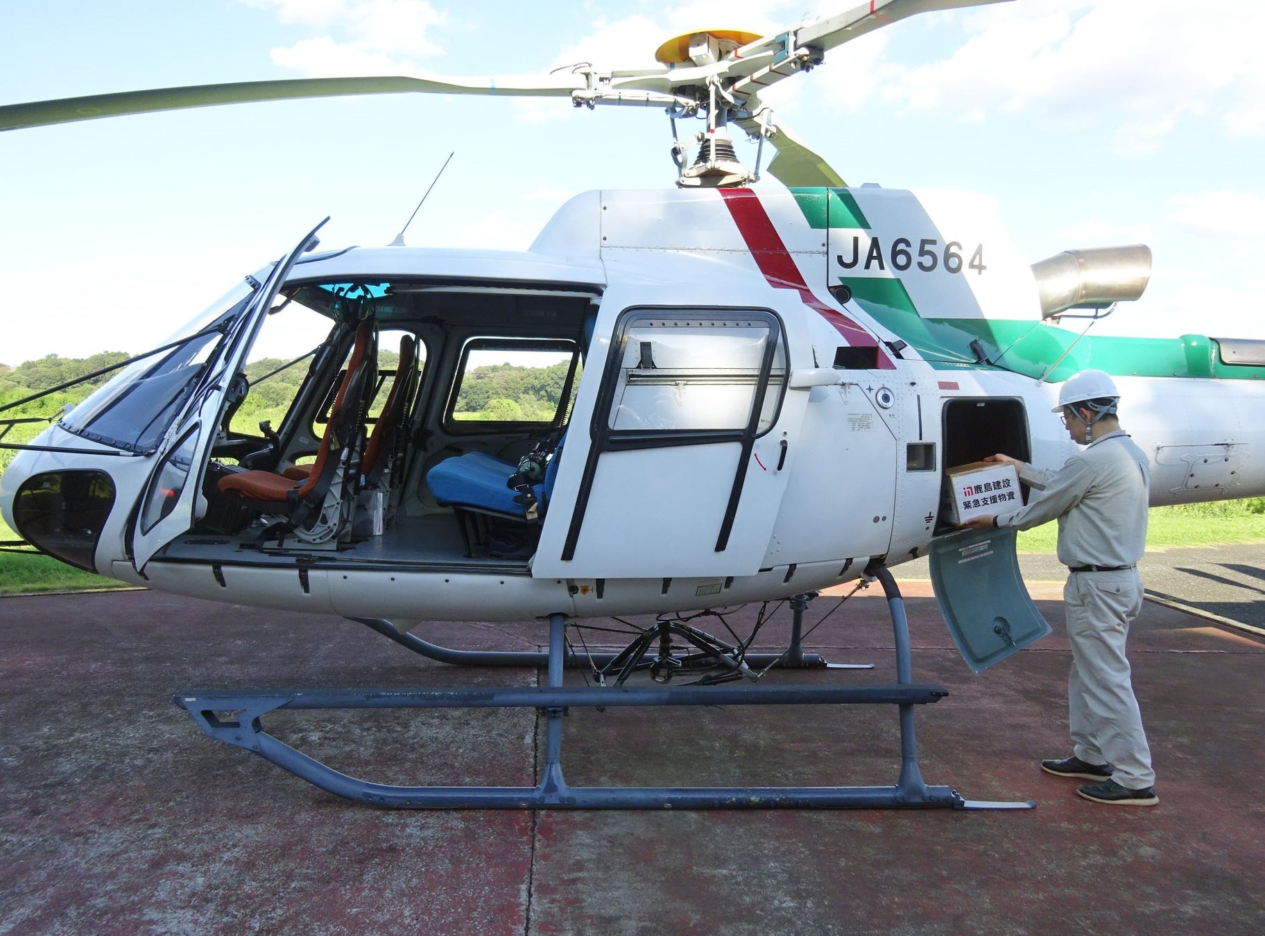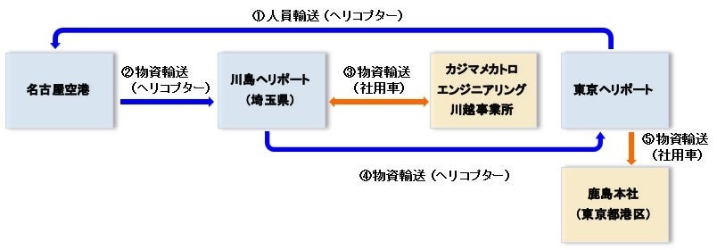 具体的には、まず、ヘリコプターで東京ヘリポート(東京都江東区)から名古屋空港(愛知県西春日井郡)へ空路で向かい、検討したルートで災害対策本部の代替拠点である中部支店に人員を輸送しました。次に、ヘリコプターに物資を積み、名古屋空港から川島ヘリポート(埼玉県比企郡)まで空輸後、物流拠点とするカジマメカトロエンジニアリング(社長:池田邦彦、東京都港区、鹿島グループ会社)の川越事業所に社用車で物資を輸送・集積。その後、集積した物資を再度、川越事業所から川島ヘリポートまで陸送し、ヘリコプターで川島ヘリポートから東京ヘリポートまで空輸後、陸路で本社まで輸送しました。