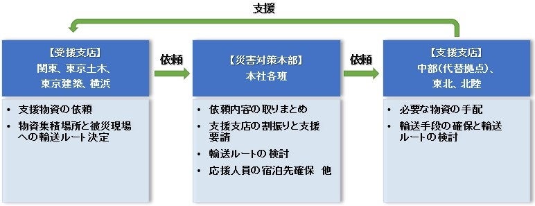 首都直下地震発生時には、首都圏が広範囲に被災することが予想されます。そのため、被災した公共交通機関や主要道路などのインフラおよび顧客企業からの復旧要請に応じる首都圏4支店を受援側、本社および東北・北陸・中部の3支店を支援側に分け、人的・物的資源を授受する連携訓練を実施しました。