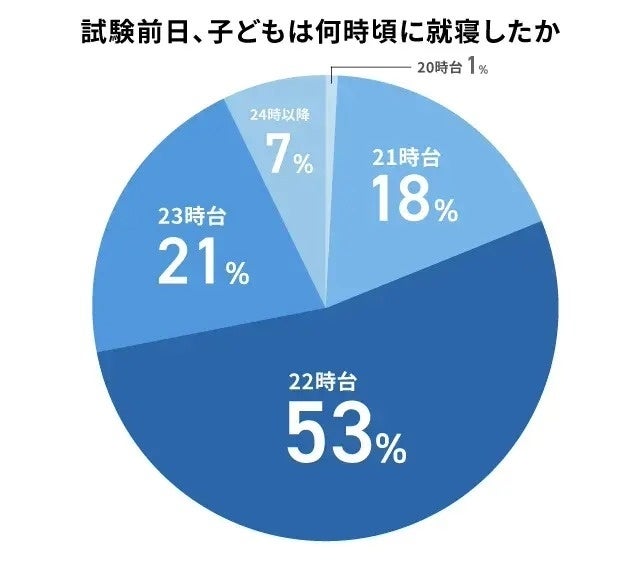 受験本番を控えた前夜、どの家庭も「しっかり休ませたい」という思いで過ごしていたようです。調査結果では、最も多かった就寝時間は「22時台」で53%。次いで「23時台」が21%、「21時台」が18%となり、全体の約9割が23時までに就寝していたことがわかりました。