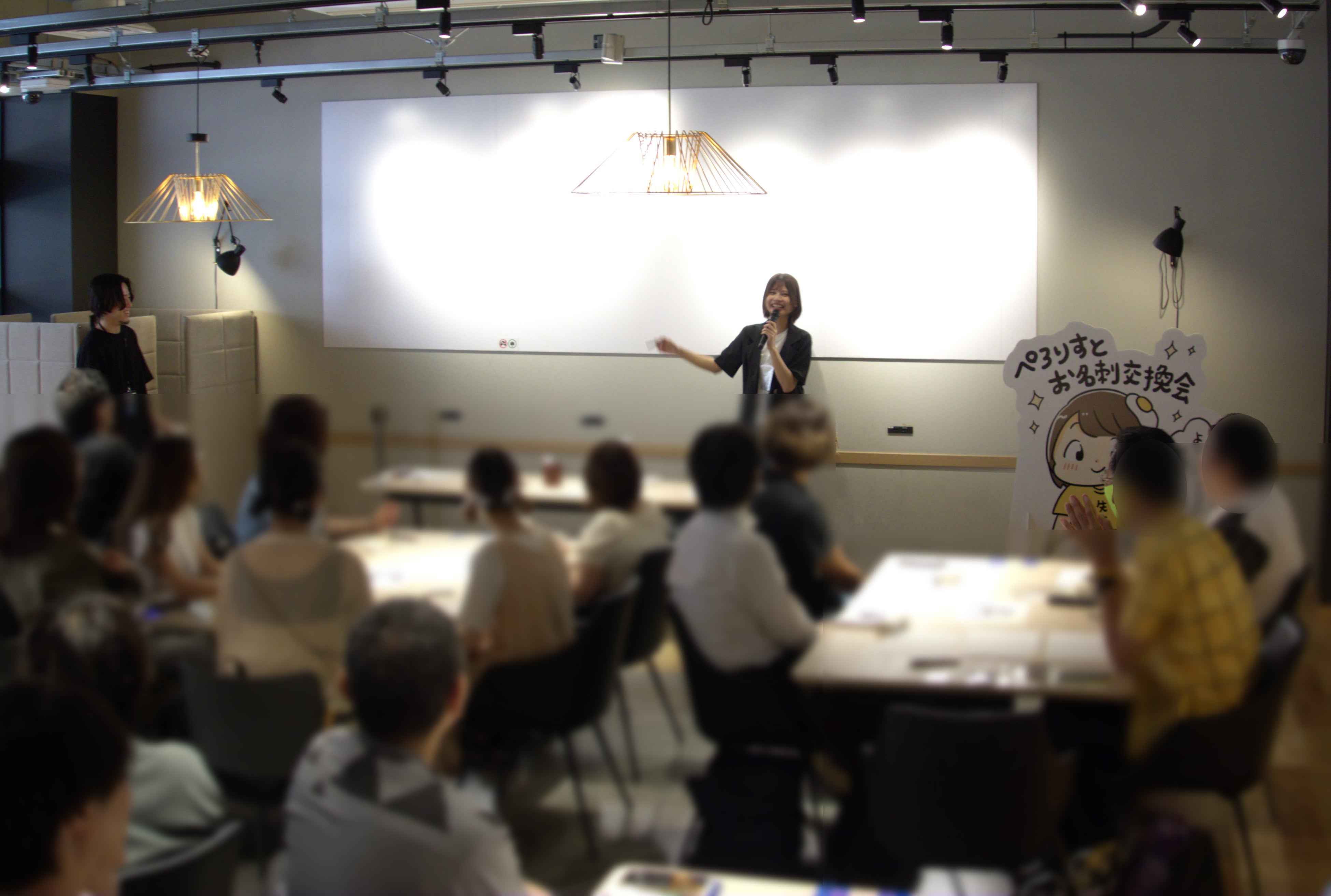 イベント「ぺろりすとお名刺交換会」は、ぺろりん先生によるオリジナルサイン作成のレクチャーからスタートしました。参加者の名刺にそれぞれ手書きサインが加えられ、硬い印象になりがちな名刺も温かみのある交流ツールに変化しました。
