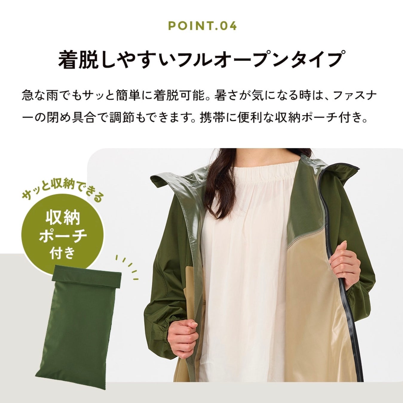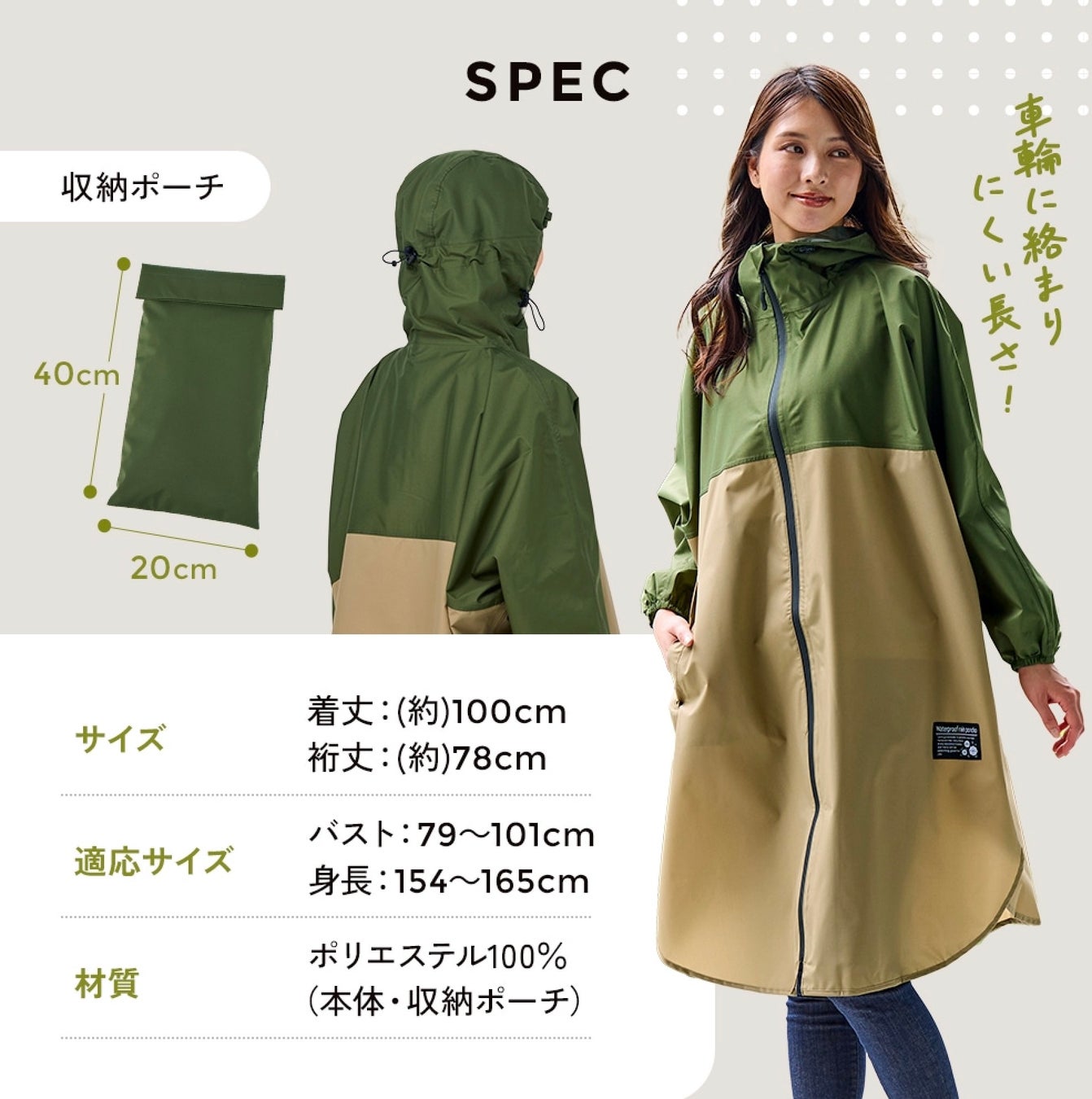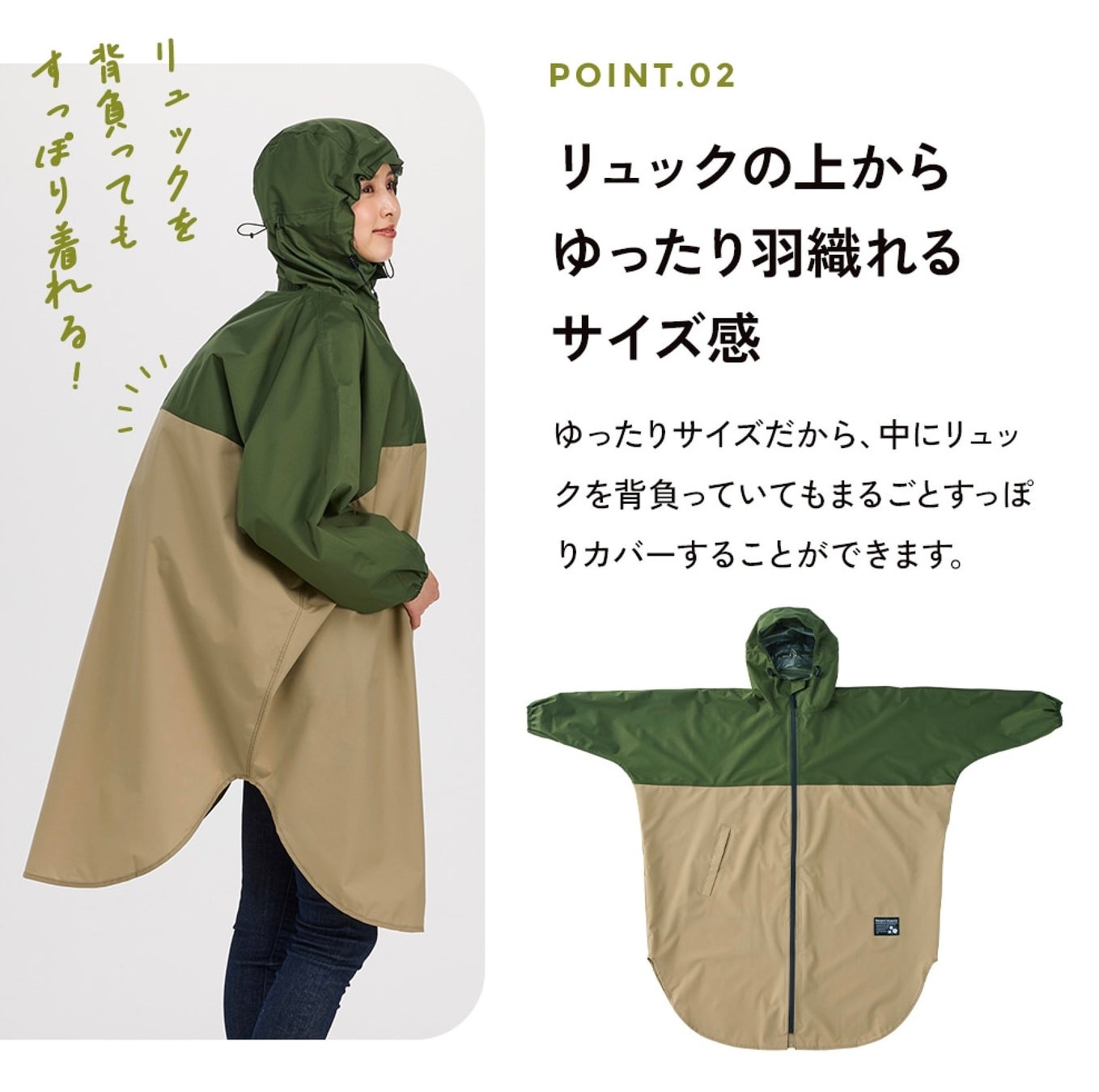 背負ったリュックなどもまるごとカバーできる、ゆったりサイズのレインコート。