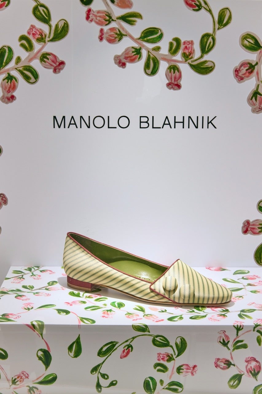 この特別なカプセルコレクションは、ロココの繊細な装飾性とマノロ ブラニクの卓越したクラフツマンシップが融合した、夢のようなラインナップです。立体的なシルエット、上質で滑らかな素材、プリーツやリボンといった細やかなディテールが随所にちりばめられ、見る者の視線を奪う一足に仕上げられています。店内は、ローズバッドプリントが空間をやわらかく包み込み、ロココ調を彷彿とさせるディスプレイが、アクセントとして配されています。ピンクトーンを基調にしたムードがコレクションのロマンティックな一層引き立てます。