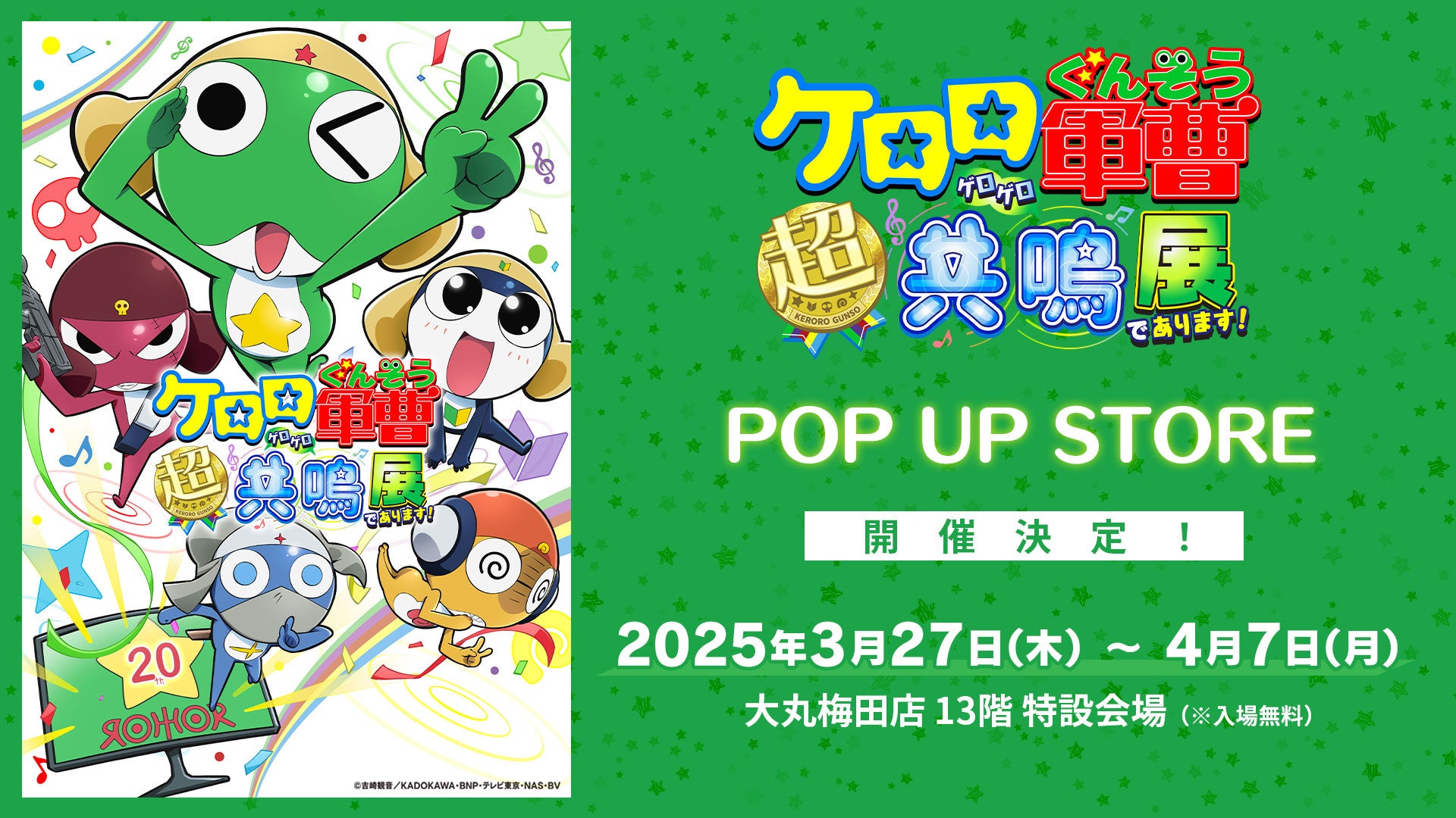 アニメ『ケロロ軍曹』放送20周年を記念したイベント「ケロロ軍曹 超共鳴(ゲロゲロ)展 であります!」。昨年4月から5月にかけて行われた池袋会場を皮切りに、熊本、吉祥寺の計3か所で実施されてきました。2025年3月27日(木)から4月7日(月)の期間限定でPOP UP ストアとして大丸梅田店(大阪府大阪市)13階特設会場にて開催いたします。