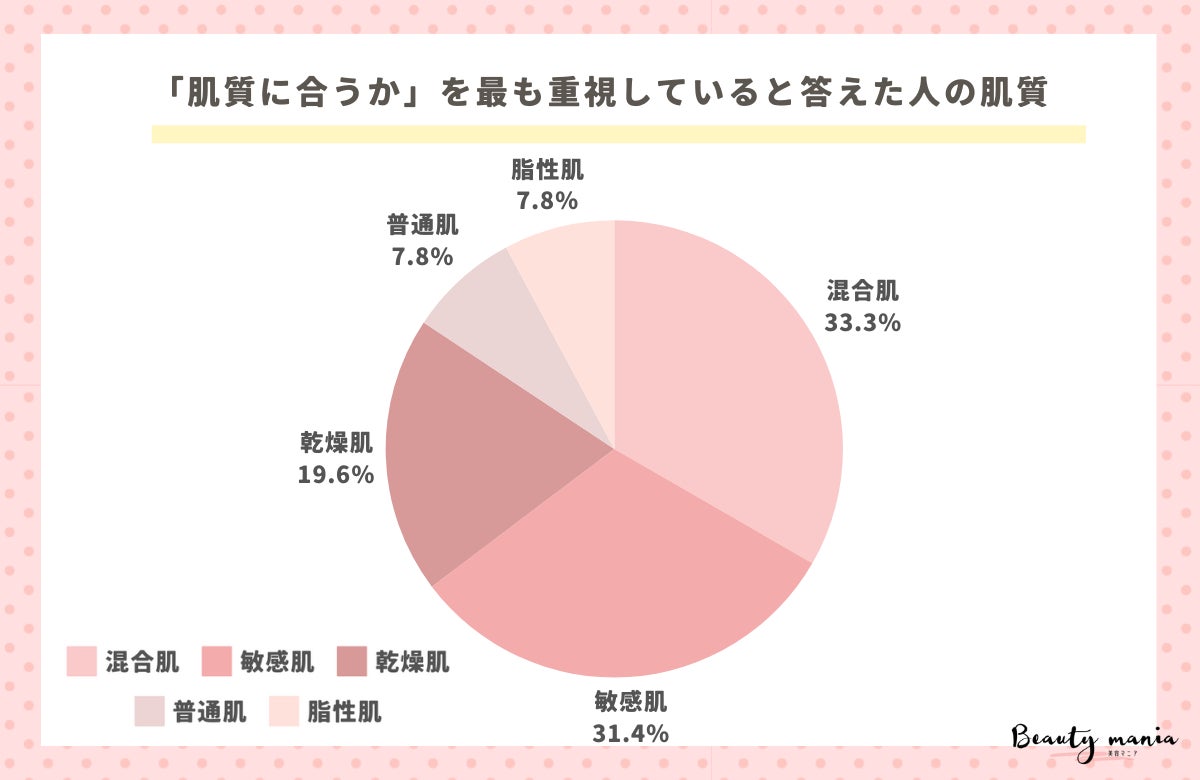 また、1位の肌質に合うかどうかと回答した人の肌質は『混合肌』と『敏感肌』『乾燥肌』の人が多い傾向でした。