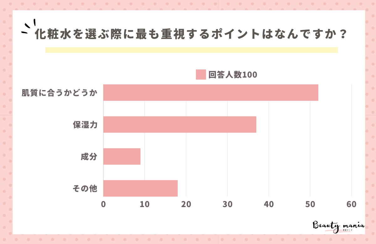 「化粧水を選ぶ際に最も重視するポイントはなんですか?」とアンケート調査した結果、1位は『肌質に合うかどうか(52人)』、2位は『保湿力(37人)』、3位は『成分(9人)』でした。