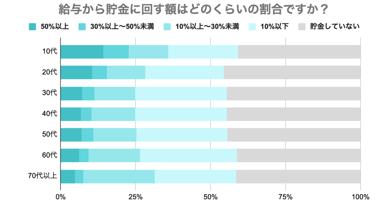 毎月の給与から貯金をしている方を年代別でみた結果、貯金している割合にはあまり違いがありませんでした。給与から貯金に回す額については、全体の約3割が10%以下と回答し一番多い結果となりました。