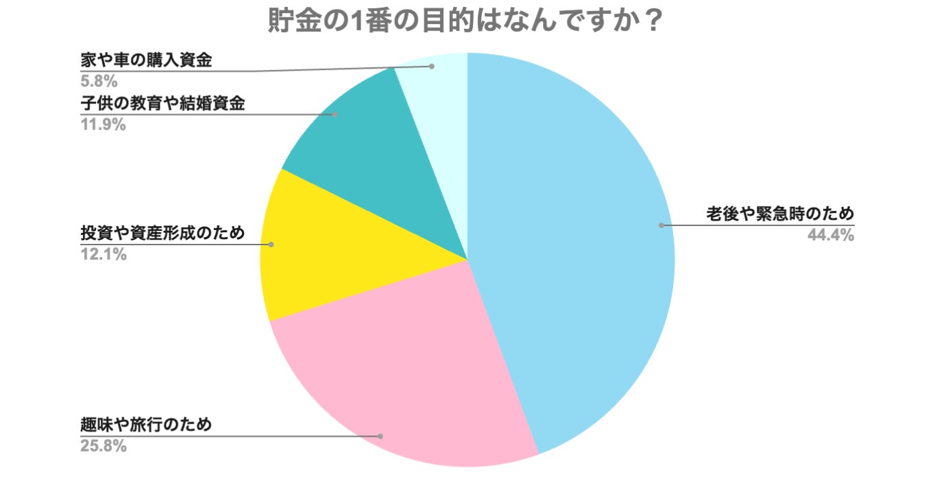 貯金の一番の目的として最も多かったのが「老後や緊急時のため」という回答で、次点で「趣味や旅行のため」が多いことが分かりました。