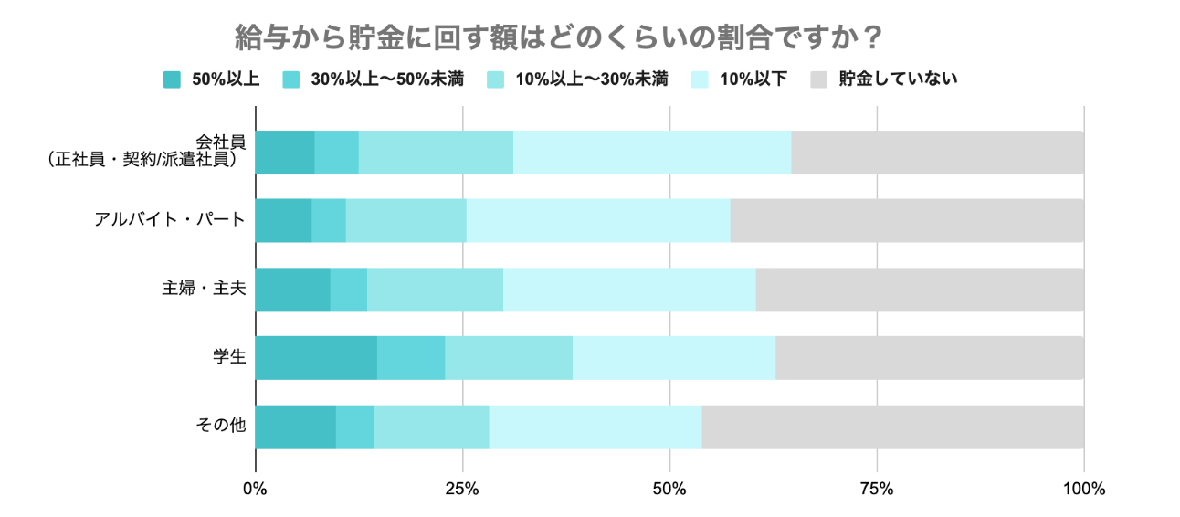 職業別でみると、会社員に次いで学生の貯金割合が高い結果で、給与の50%以上を貯金している方は学生が一番多い割合となりました。