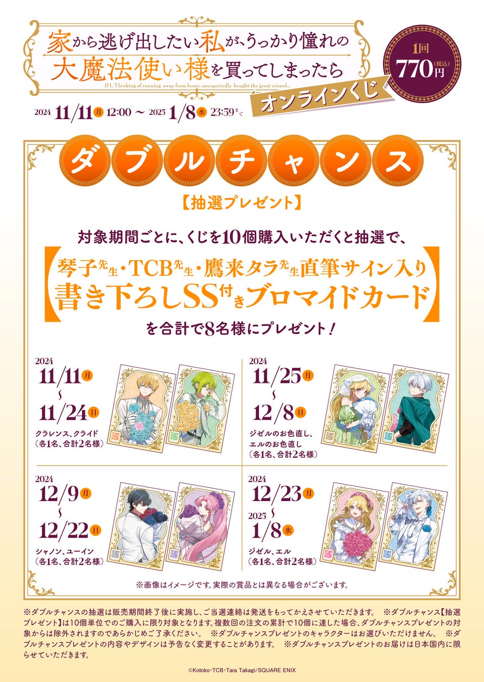 対象期間ごとに、くじを10個ご購入いただくと抽選で、【琴子先生・TCB先生・鷹来タラ先生直筆サイン入り書き下ろしSS付きブロマイドカード】を合計で8名様にプレゼント!