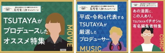 DVDレンタルコーナーでは「TSUTAYAがプロデュースしたおすすめ特集」、CDレンタルコーナーでは「平成・令和を代表する、TSUTAYAが厳選したプロデューサー」、コミックレンタルコーナーでは「あの漫画に、この人あり。TSUTAYAイチオシの有名編集者特集」をテーマとしてピックアップした商品をご紹介する特集コーナーをTSUTAYA店頭にて展開いたします。ぜひ店舗に足をお運びください。