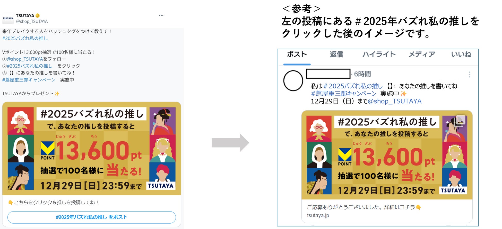 キャンペーン期間中にTSUTAYA公式X(https://x.com/shop_TSUTAYA)の投稿から、「#2025バズれ私の推し」のハッシュタグをつけ、来年ブレイクすると思うあなたの推しの名前とともにXに投稿いただいた方の中から抽選で100名様にVポイント13,600ポイントをプレゼントいたします。