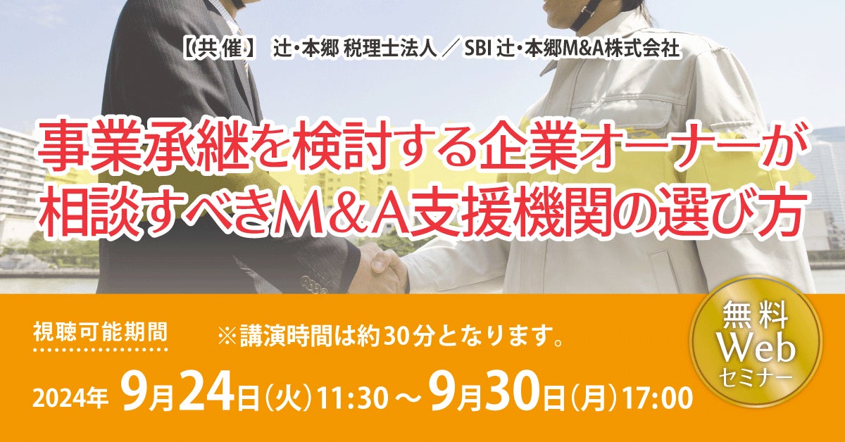 辻・本郷 税理士法人(本社:東京都新宿区、理事長:徳田孝司)は、SBI 辻・本郷M&A株式会社(本社:東京都千代田区、代表取締役:小林堅悟)と2社共催で「事業承継を検討する企業オーナーが相談すべきM&A支援機関の選び方 」セミナーを開催いたします。昨今、中小企業の事業承継課題を解決する手段として「M&A」の活用が増加しています。実際、後継者がおらず、M&Aを検討している企業オーナーも少なくありません。そのような状況の中で、相談相手となり得るM&A支援機関(中小企業庁が管轄するM&A支援機関登録制度)に登録されている会社は2,000社を超えています。本セミナーでは、事業承継に悩む企業オーナーが本当に相談すべき相手について、事例も交えてわかりやすく説明いたします。