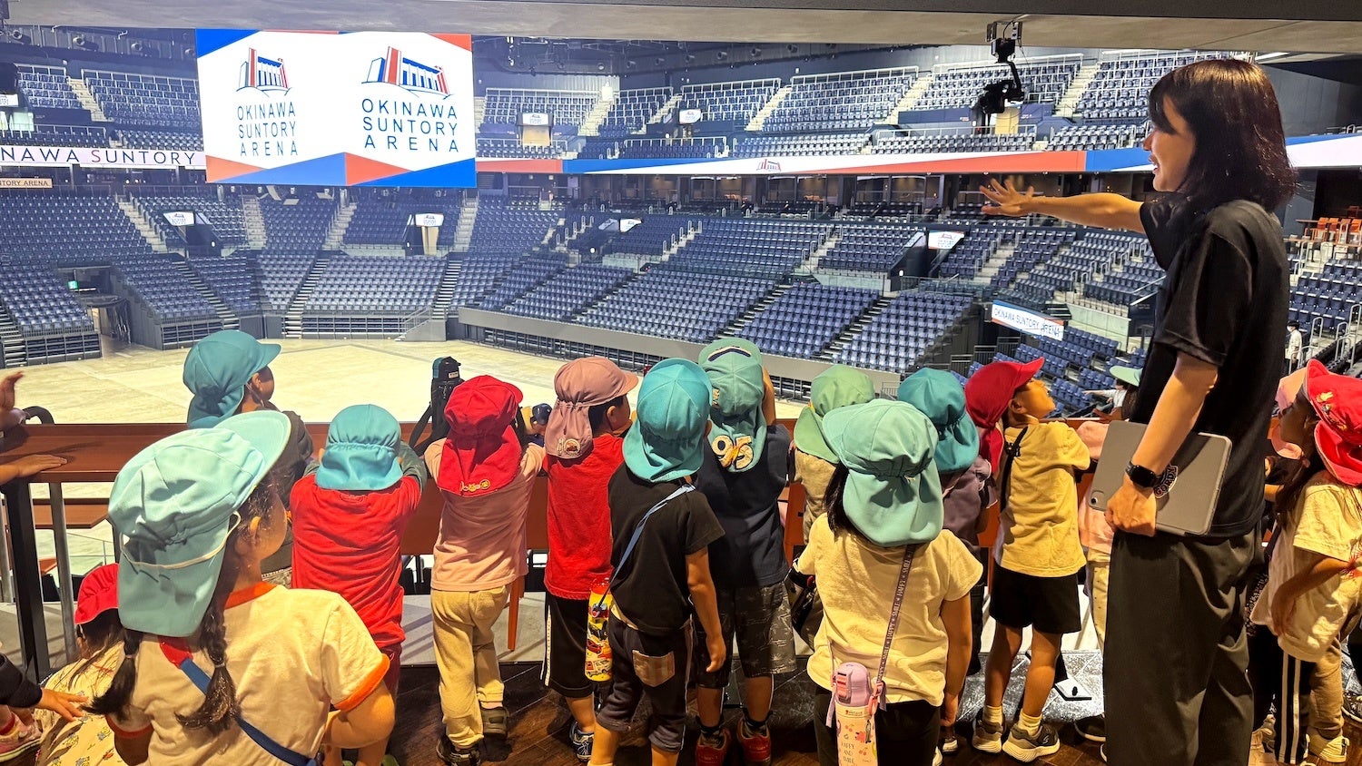 当日は、スイートルームや5階パノラマラウンジからフロアを見学いただき、2階コンコースではキッズコンテンツ体験を通して、沖縄サントリーアリーナならではの空間を楽しんでいただきました。