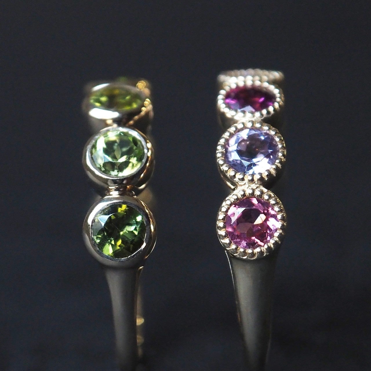 PARCELLE JEWELRYの定番コレクション『ミルシェノン』が、新たなデザインで登場。これまでのミル留めではなく、ふせ込みで石を留めることで、より滑らかで洗練されたフォルムに。中石の透明感が際立ち、瑞々しい輝きを楽しめるデザインに仕上がりました。角のない石枠が指当たりも優しく、春先の装いにもぴったりの一本です。