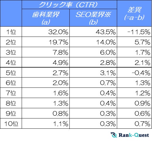 6位以降は歯科業界の方がやや高い数値を示しており、下位の順位でも一定数クリックされる余地があるようです。