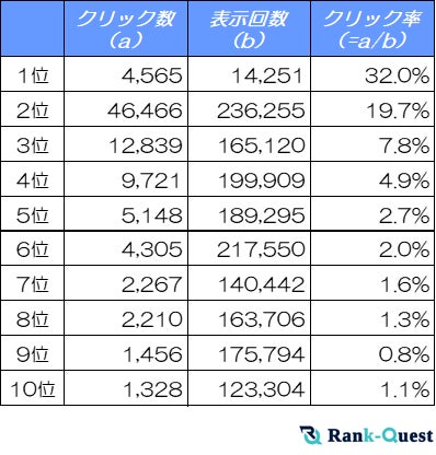 https://rank-quest.jp/column/column/how-to-seo/ 【SEO対策】で検索順位No.1を獲得した(注1)ランクエストが1~10位の検索順位毎のクリック率を解説