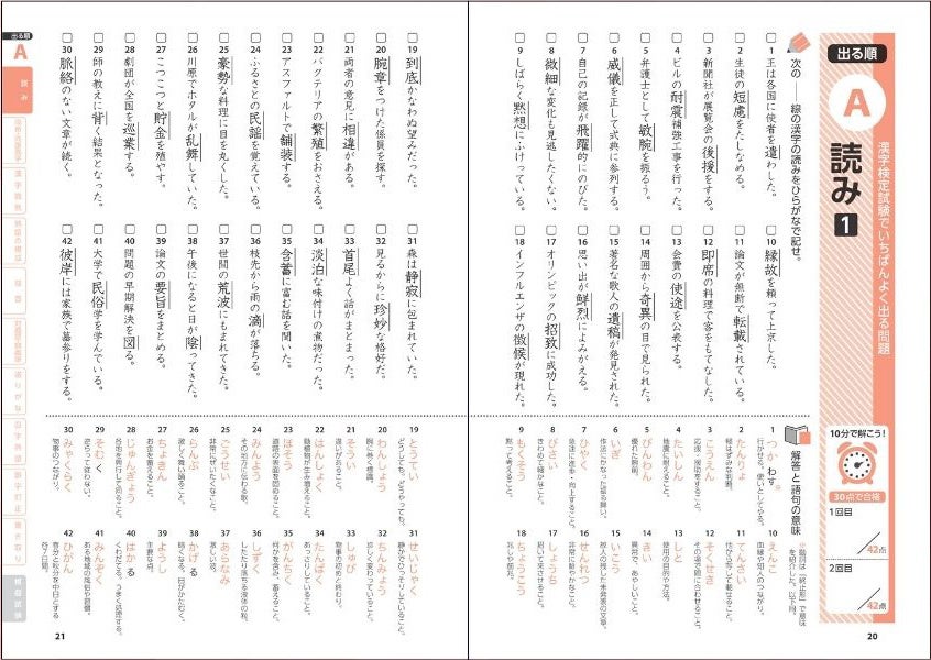 最新の出題傾向を正確に反映した「出る順」で構成されているため、効率よく学習できます。「読み」、「四字熟語」、「書き取り」といった出題ジャンルごとの練習問題を豊富に紹介しています。