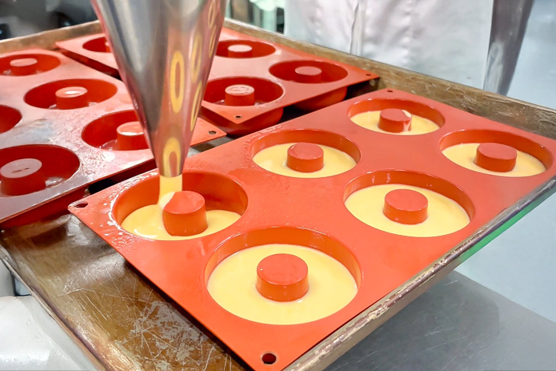 ① 発酵バターをたっぷり使った米粉生地を型に流し込む