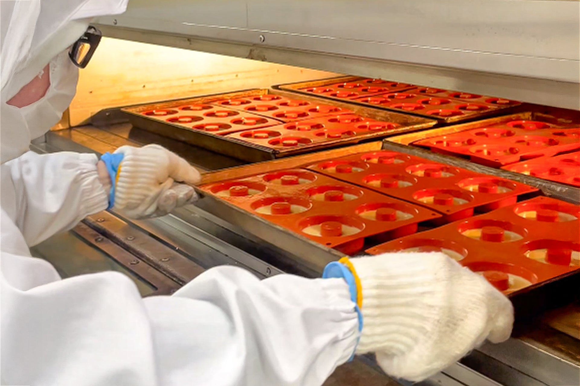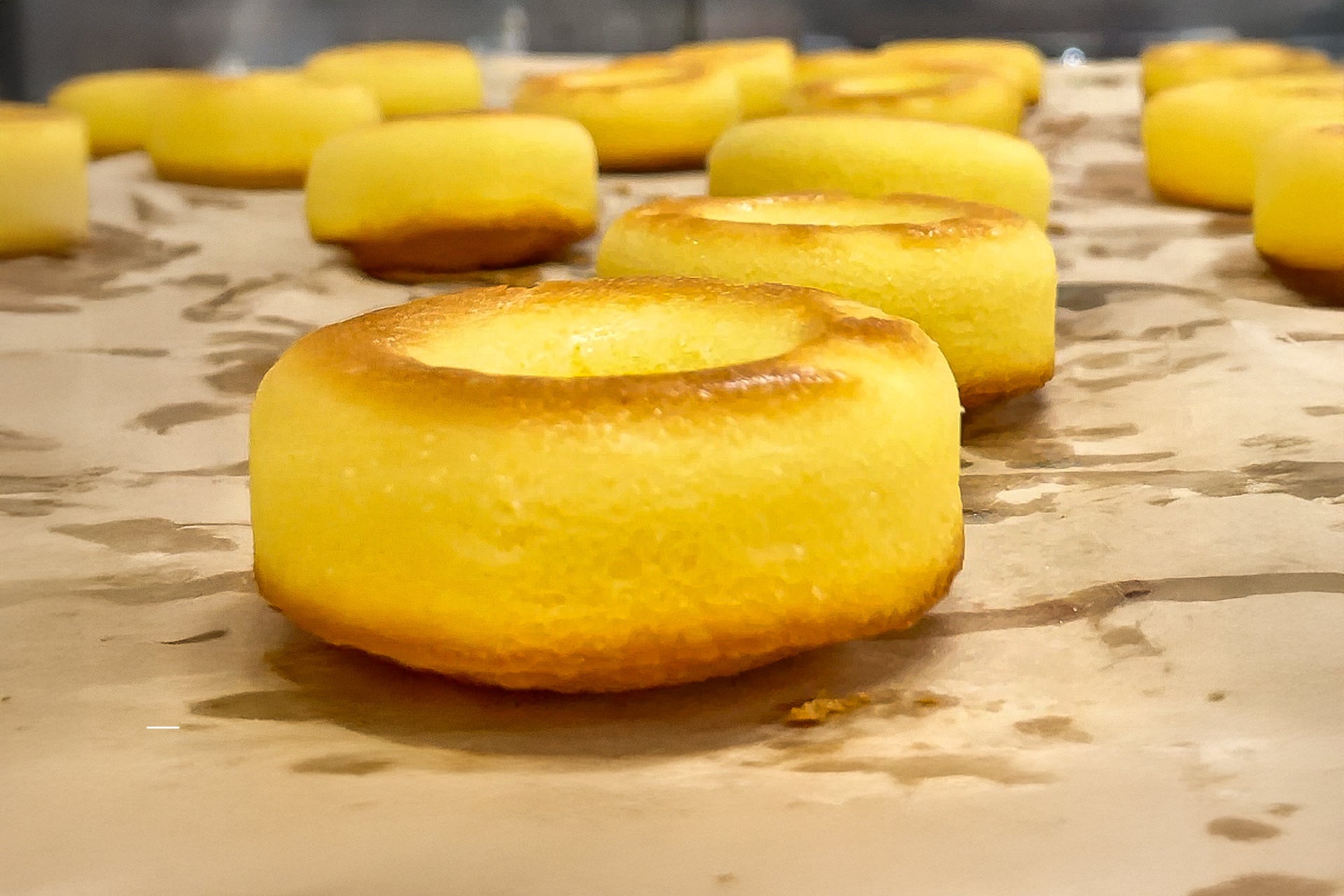 小麦生地に比べ、米粉生地は膨らみや焼き色に差が出にくく、断面もきめ細かく整います。この安定した焼き上がりが、軽い口どけとしっとり感を両立させる理由です。