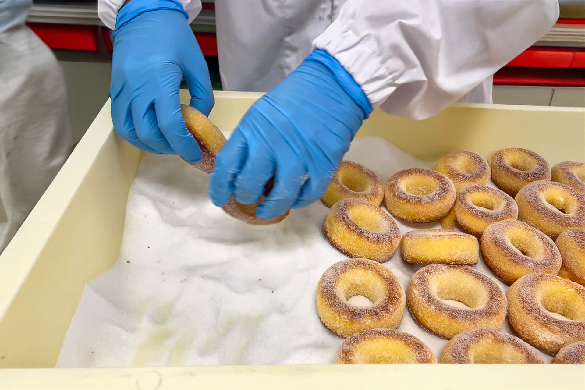 焼き立ての熱々のドーナツに、グラニュー糖を惜しみなくコーティング。