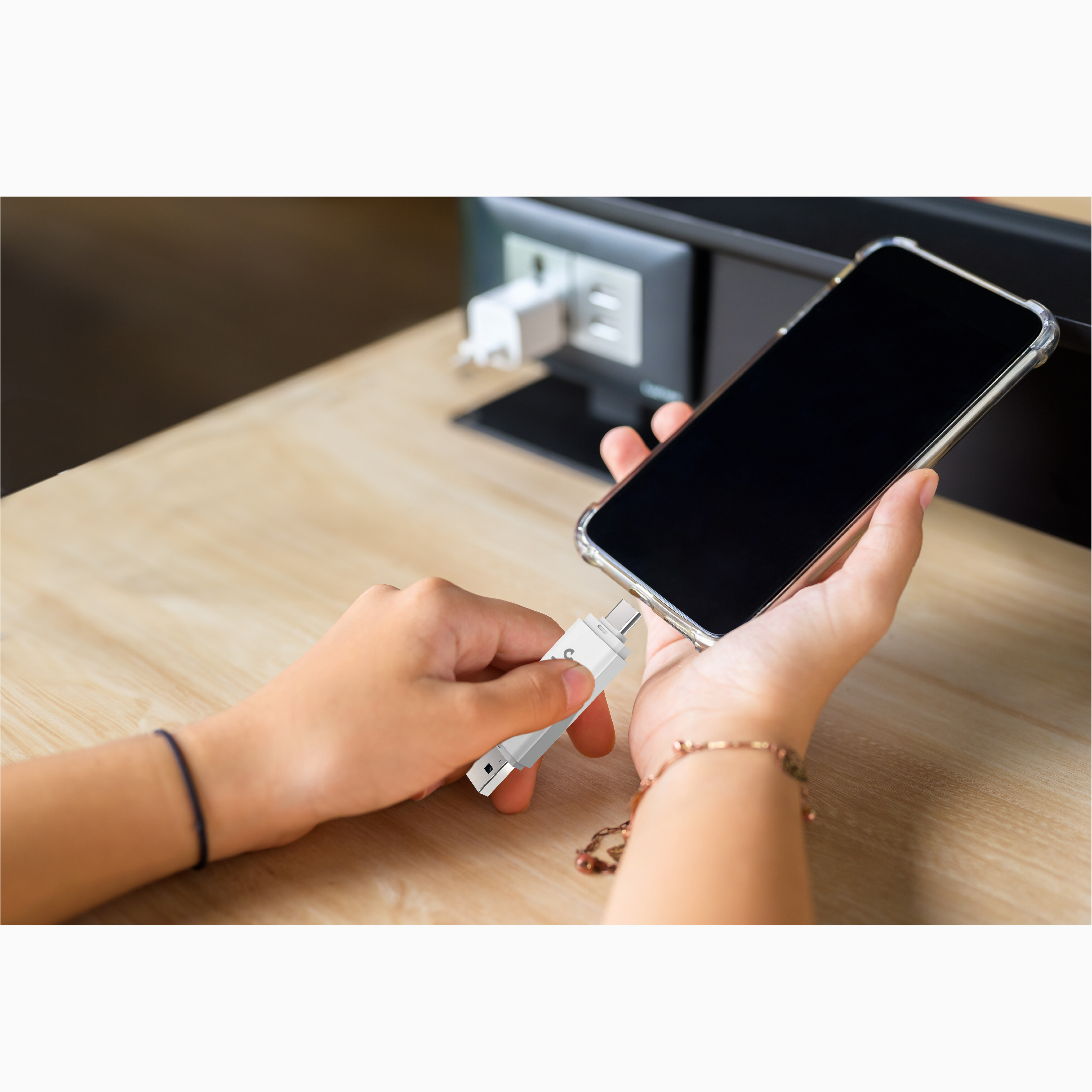 USBメモリ「ANGV-CRUAC032-A-W / 064-A-W / 128-A-W」は、Type-AとType-Cの2つのコネクタを搭載したモデルです。パソコンやスマートフォンなどに直接接続することができるので、写真や動画のバックアップなどに便利です。