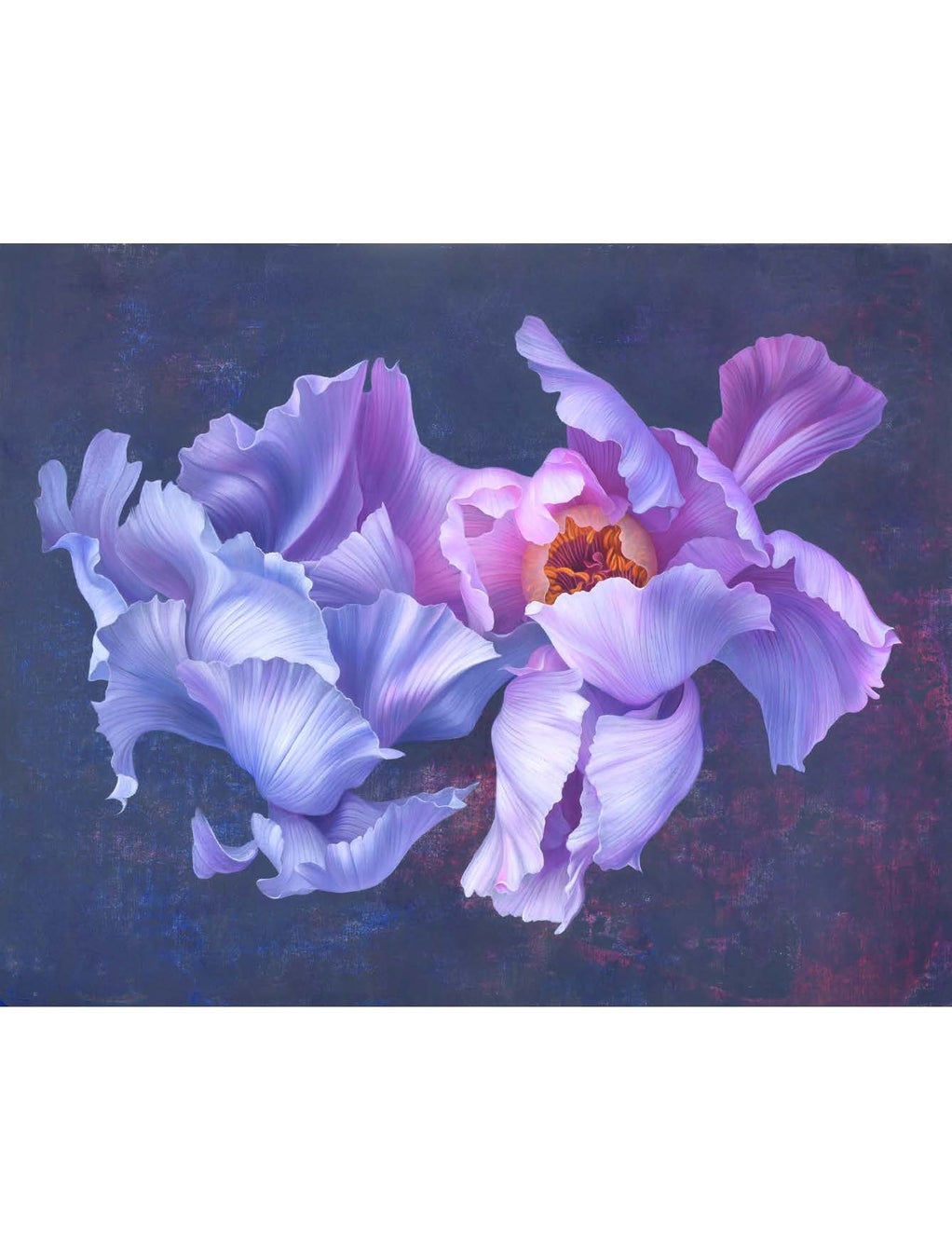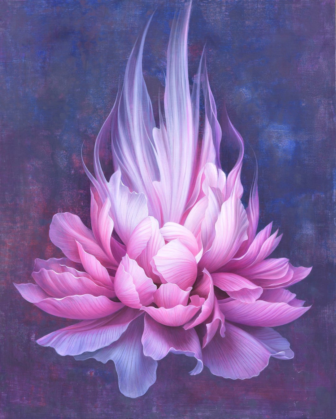 1971年東京都生まれ。東京藝術大学大学院美術研究科修士課程修了。花の秘めたるエネルギーの盛衰の中に、宇宙、時間、命、死といった普遍的テーマを落とし込み、それらの象徴として花を描いています。モチーフとなる花は、植物園などでの取材からフォルムの美しさや面白さを感じるものを選び出し、不必要に美化せず花の持つ存在感を活かし、細い筆を用いて線の重なりで形を描き起こします。何層にも絵具を塗り重ねることで生まれる下地の深い奥行きが、画面に独特の風合いを与え、細密かつ鮮やかに描いたモチーフとの対比がより際立ちます。