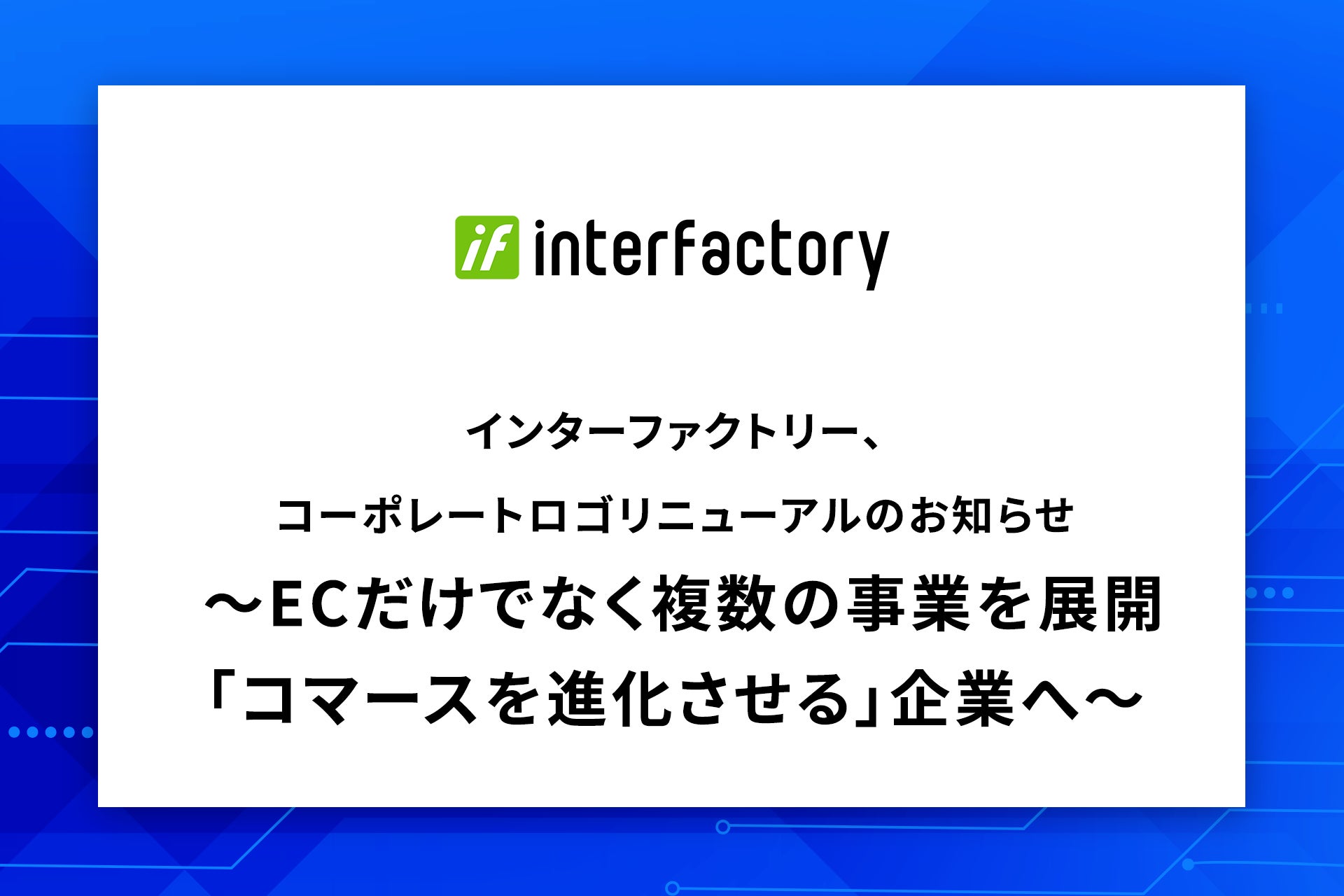 株式会社インターファクトリー(本社:東京都千代田区、代表取締役社長 兼 CEO:蕪木 登、以下 インターファクトリー)は、コーポレートロゴをリニューアルしたことをお知らせいたします。2003年の設立以来、初めてのロゴリニューアルとなります。インターファクトリーの事業目的である「コマースを進化させる」を形にするべく、さらなる事業成長と企業価値の向上を目指してまいります。