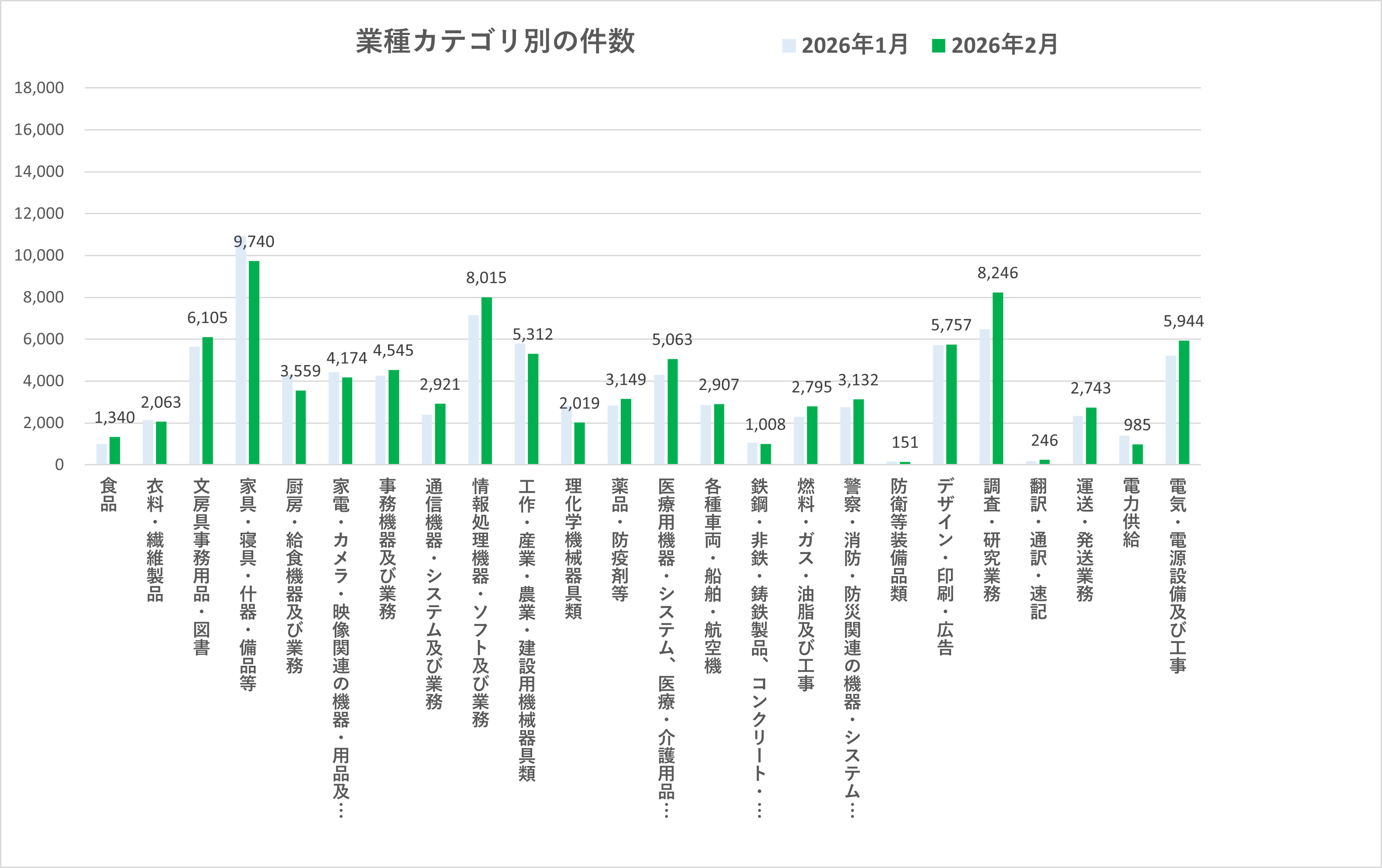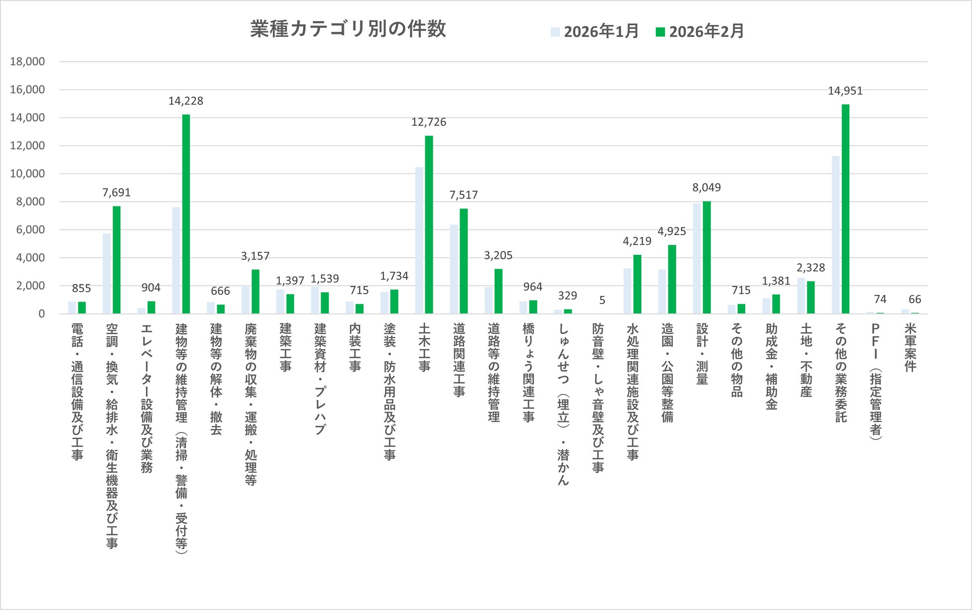 2026年2月の業種別入札件数では、多くのカテゴリで前月から増加が見られました。