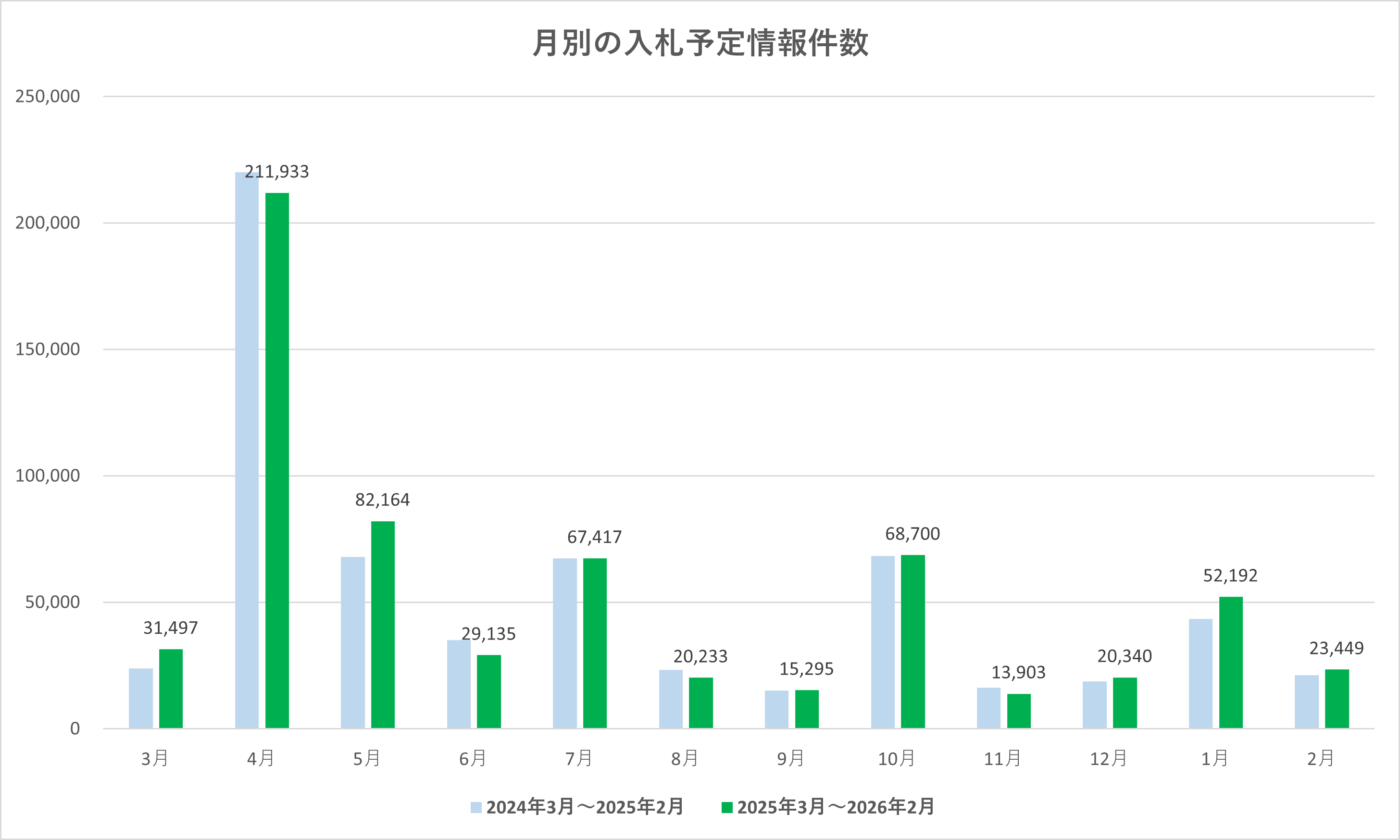 2026年2月の入札予定情報件数は23,449件でした。前月(2026年1月:52,192件)から28,743件の減少(前月比44.9%)となりました。一方、前年同月(2025年2月:21,172件)と比較すると2,277件の増加(前年同月比110.8%)となっています。