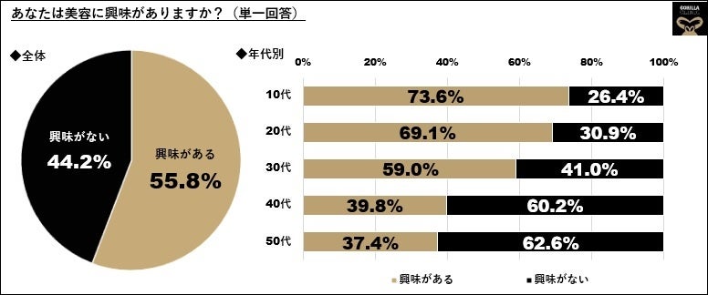 - ①【男性の美容意識】約6割(55.8%)が「美容に関心あり」と回答、「関心なし(44.2%)」を上回る