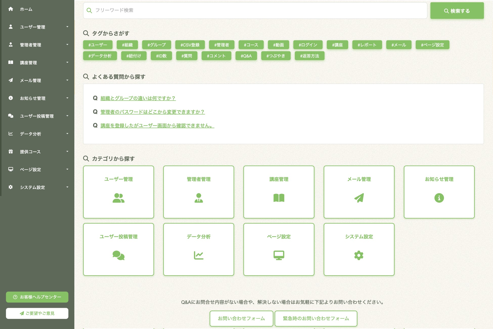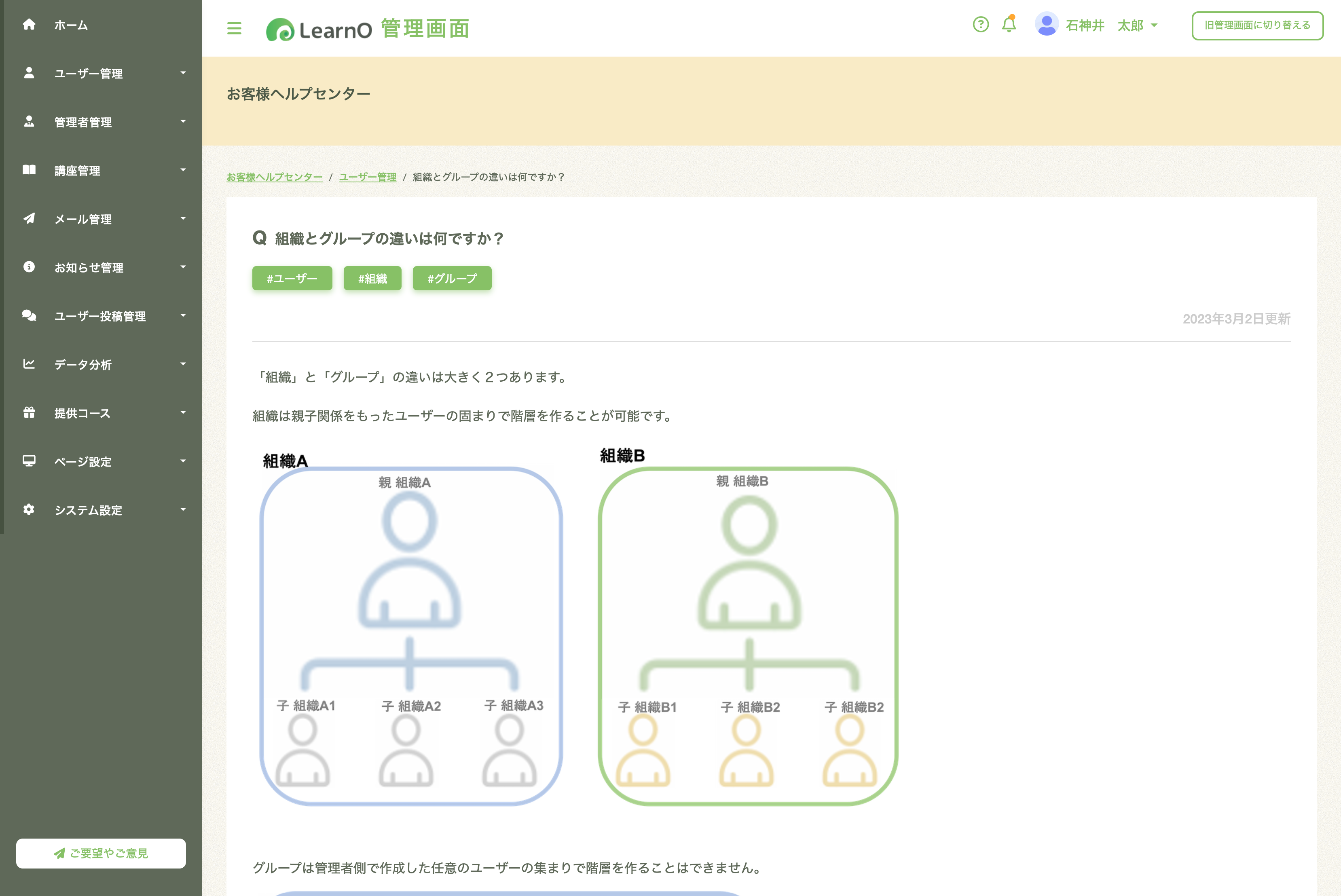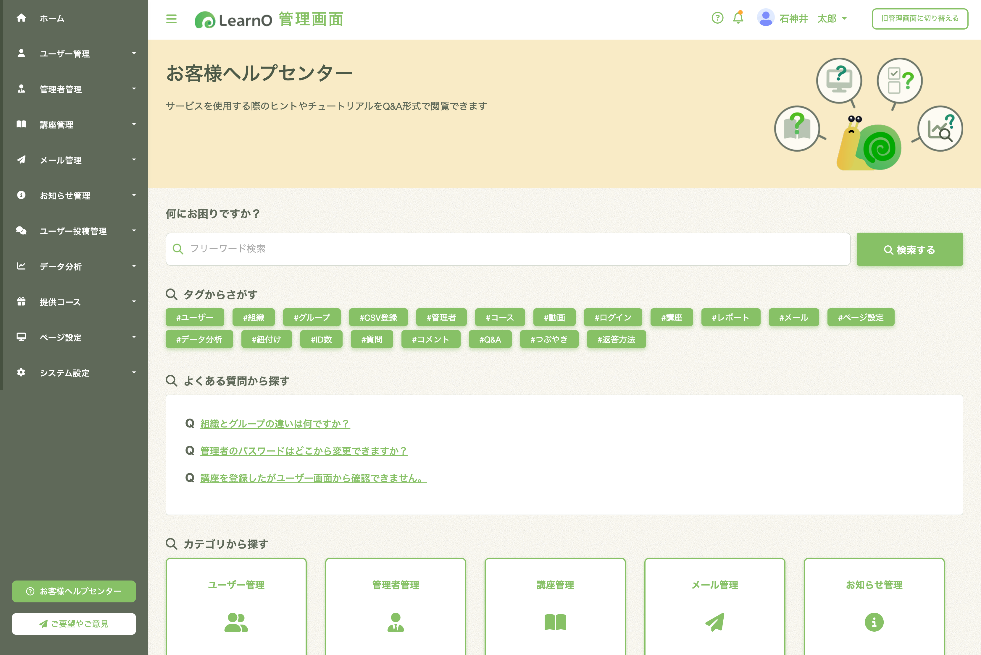 そんな10周年記念企画の一環として今回、「お客様ヘルプセンター」を公開しました。「お客様ヘルプセンター」とは、LearnOの管理画面に関する疑問や悩みを管理者ユーザー自身で解決できるように公開されたQ&A形式のWebマニュアルになります。