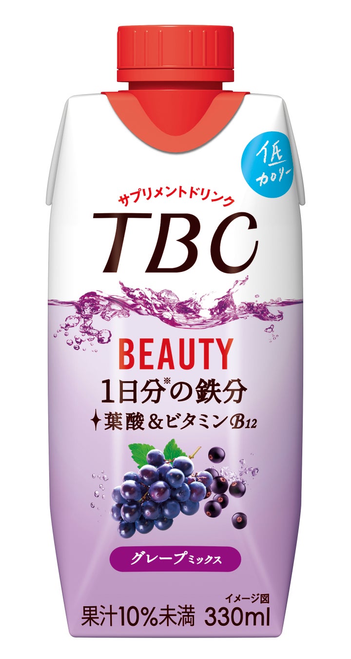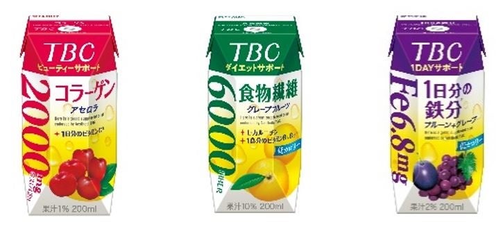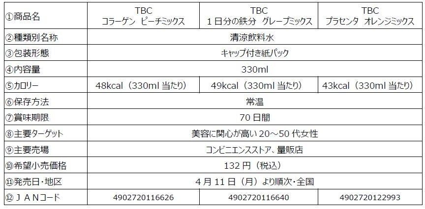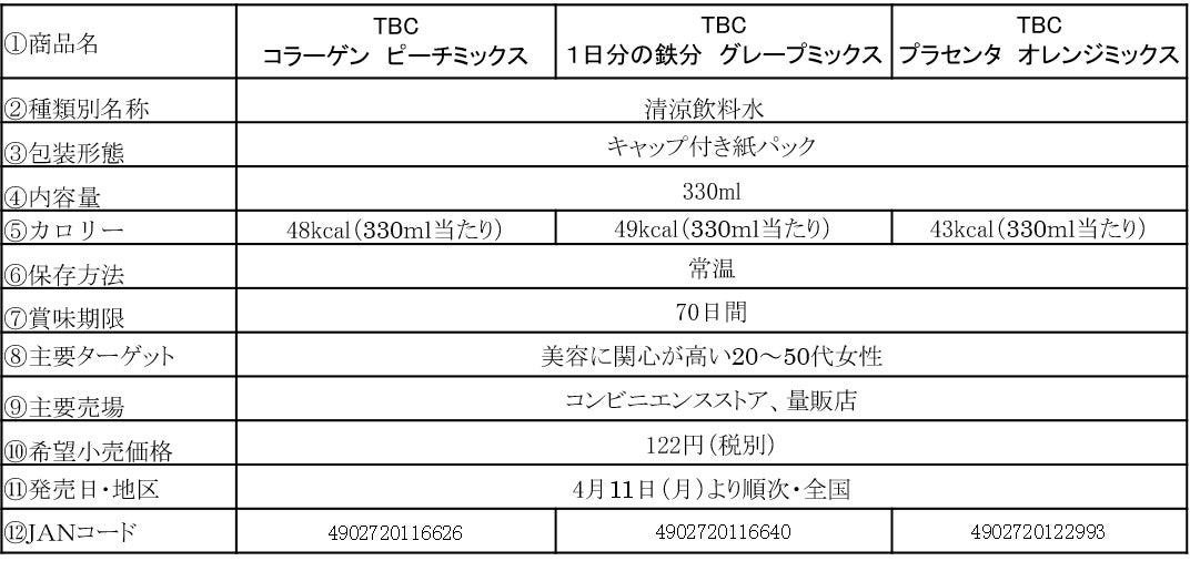 「TBC コラーゲン ピーチミックス」は、女性に嬉しいコラーゲンとヒアルロン酸を一緒に摂れ、「TBC 1日分※3の鉄分 グレープミックス」は、普段の食事では必要量を摂取しにくい、1日分※3の鉄分・葉酸・ビタミンB12を一緒に摂れ、「TBC プラセンタ オレンジミックス」は日常生活において摂り入れにくいプラセンタと1日分※3のビタミンCを一緒に摂れるドリンクです。3品ともリフレッシュしながらカラダの内側から美容をサポートできる、低カロリーでさわやかな味わいに仕上げています。