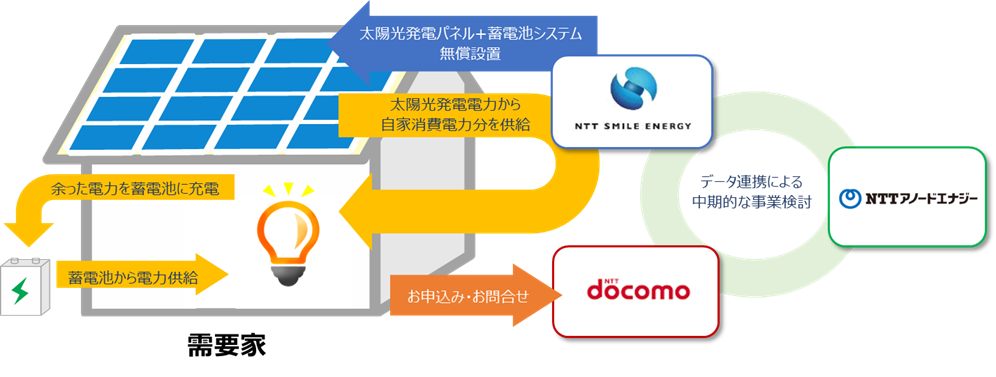本連携3社は、スマイルエナジーの太陽光発電・蓄電池を利用した家庭向けエネルギーサービスを、エリア限定で提供いたします。お客さまは月額定額、初期費用無料にてご家庭に太陽光発電パネル、蓄電池を設置することができます。 サービス提供により得られたデータやノウハウを3社にて共有することで、事業性の検証を行い、ドコモの新たなサービス検討に活かしてまいります。