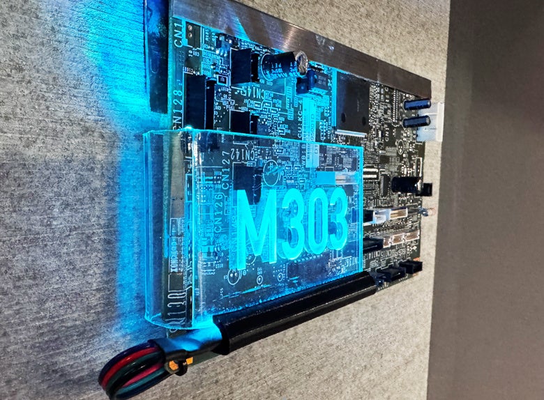 ミーティングスペースなどには、京丹後の海に沈んでいた木材や倒木を加工したオリジナル什器を設置、アップサイクルした複合機の廃基盤を会議室の案内プレートに採用するなど、資源の有効活用にも取り組みました。また、事業所床面に環境配慮型商品を使用しています。