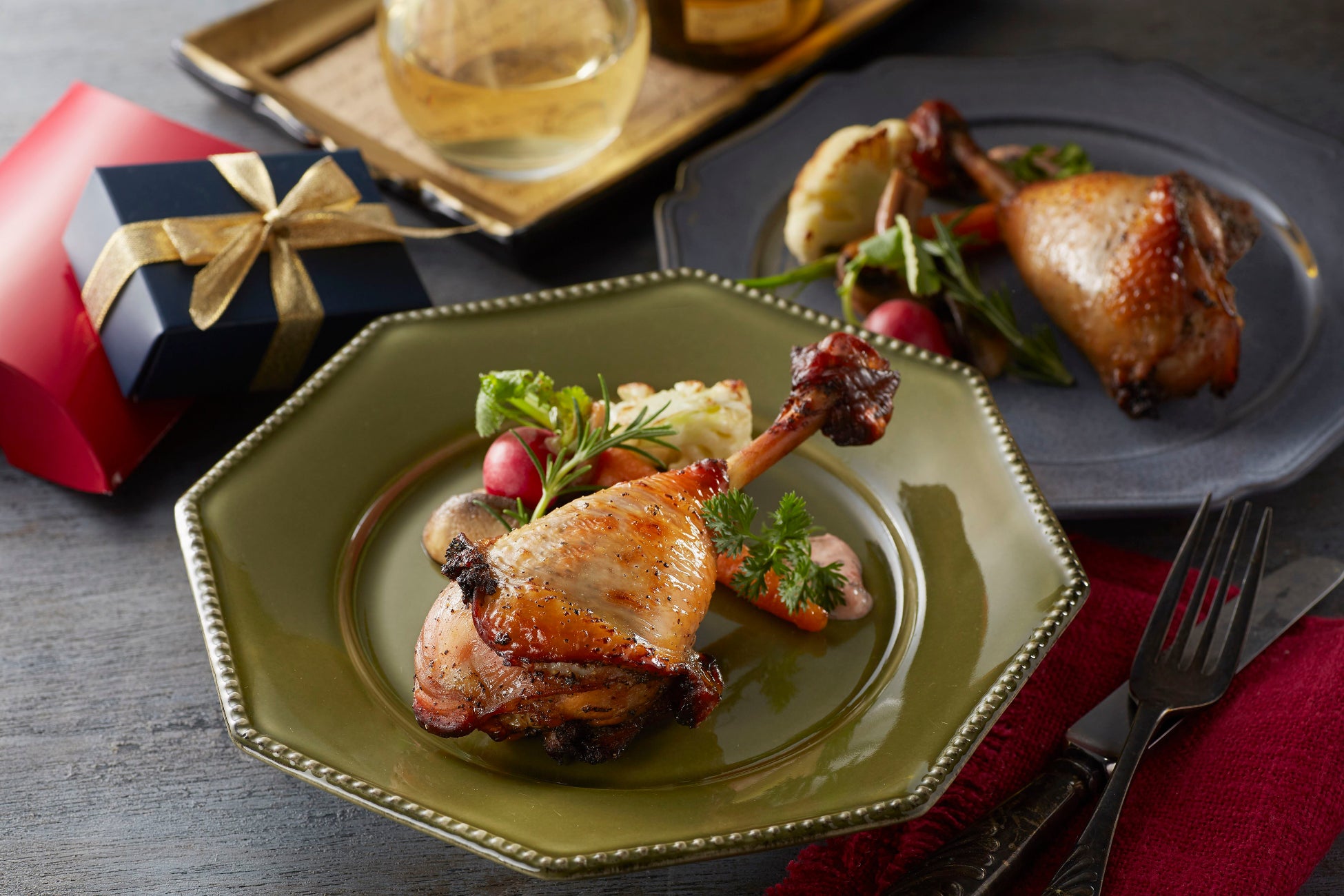 佐賀県のブランド鶏、みつせ鶏の美味しさをギュッと引き出した、骨付きもものローストチキン。肉の旨みが引き立つ、ペッパー仕立てのスパイシーな味わいです。