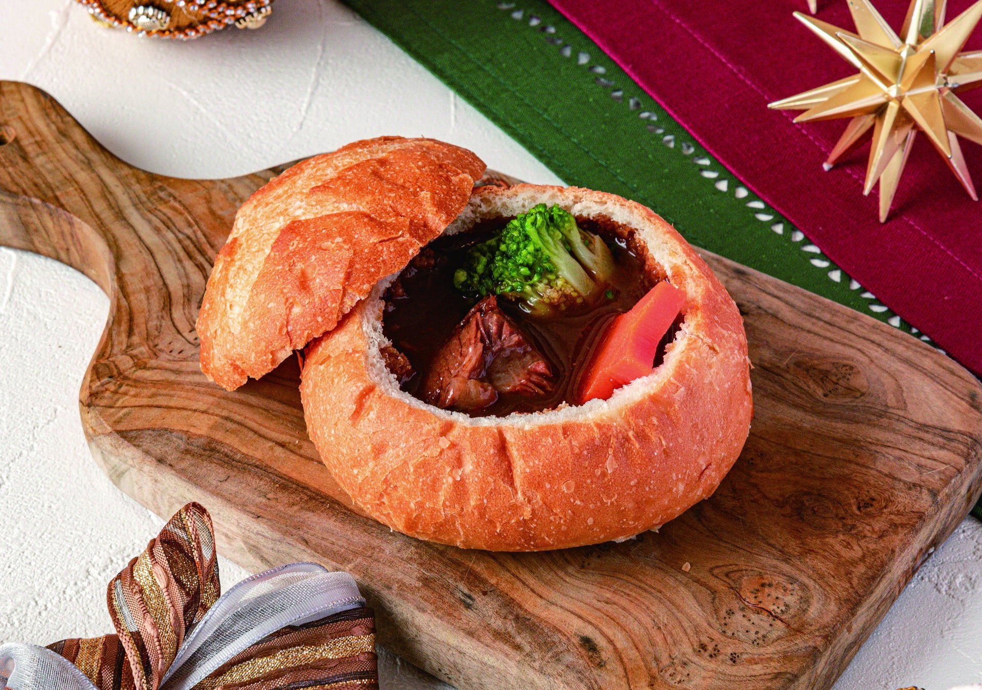 赤ワインでじっくり柔らかくなるまで煮込んだ牛肉のビーフシチューを、うつわごとお召し上がりいただけるパンのお皿でご提供します。