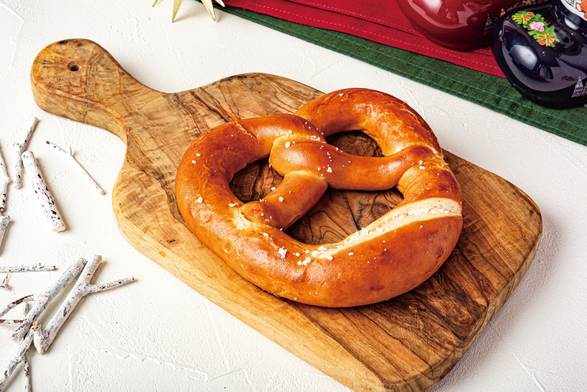 結び目の形が特徴のドイツ伝統の焼き菓子パン。通常のソルトテイストに加え、別添えのチーズやバターソースもご用意しています。