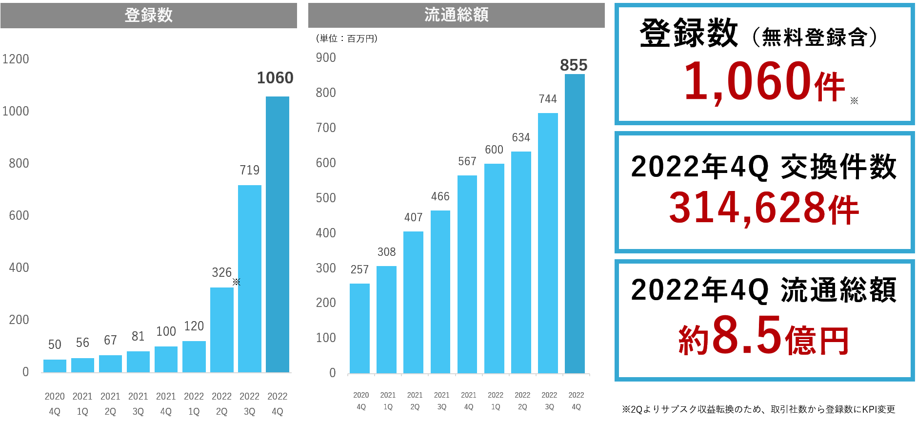 2022年度通期目標である登録数1,000件に向け、展示会を中心とした営業活動への投資、代理店契約の推進など、営業活動強化の動きを積極的に行った結果、第2四半期以降より登録数が大幅に増加、目標を達成することができました。登録数増加に伴い「デジタルギフト®」及び「デジタルウォレット」の流通総額、トランザクション数も増加し、2022年9月期第4四半期に過去最高となる8.5億円、30万件をそれぞれ突破することができました。今後は、ご登録いただいた1,000件超の登録者様に対して、継続的にご活用いただけるような提案を展開し、アカウント毎の利用率の向上と利用額の向上を目指してまいります。