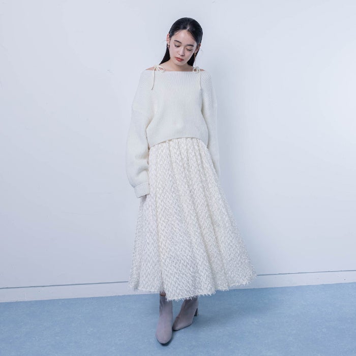 ワンピースは立体感のあるシャギー生地なので、1枚でも華やかかつ上品なコーデが完成します。