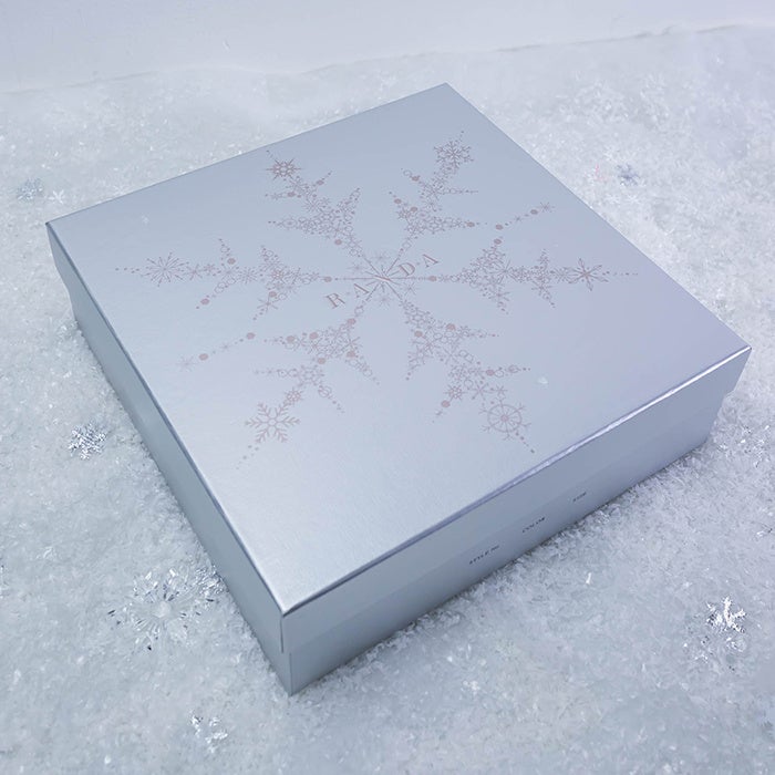 煌めくシルバーカラーのBOXに、雪の結晶を型押しした特別なデザインです。