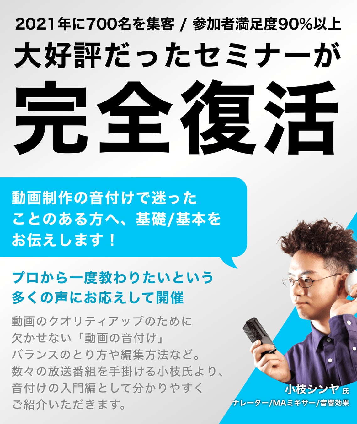 2021年3月に小枝様をゲストにお招きし開催いたしました「プロが教える!動画の音付け~MA・整音:入門編~」では700名以上の方々にご参加いただき、ご好評をいただきました。開催後、参加いただけなかった方から「もう一度開催してほしい」といったリクエストを多くいただいたことから、今回アンコール企画としてセミナーを開催することとなりました。