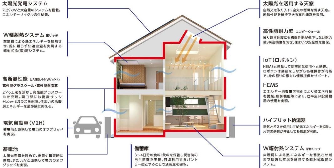 | <抑える> ・ポラスオリジナル高性能耐力壁「Endure Wall」の採用(地震エネルギーを吸収し、構造損傷を防ぐため、耐震のみの住宅と比べて地震の揺れを 50%低減)で、熊本地震のように 1か月で震度5弱以上の地震が22回も起きるなど、「繰り返す地震」にも強い作りとなっています。 ・エネルギーについても、2×6工法の強みを活かした高性能グラスウールと樹脂サッシ+Low-Eガラスの配置で、 UA値0.44W/㎡・k という高断熱性能を実現しており、冷暖房エネルギーの消費を抑制しています。また、ハイブリッ ド給湯器、W 輻射熱システムも採用しています。 <創る> ・太陽光発電システム 7.29kW の大容量システム搭載で、理論上1 か月の電力消費量を賄うことができます。 <貯める> ・蓄電システム採用。太陽光発電の余剰電力は貯めて、夜間などに供給します。また EV と連携して充放電すること により、電力のオフグリッドに貢献します。 <賢く使う> ・HEMS 搭載。家庭でのエネルギー使用状況を可視化することで、省エネ行動を誘発します。 ・HEMS と連動して家庭内の様々な設備機器を効率的に使用することへと誘導します。 <外観・内観> ・白い外壁にオレンジ瓦の可愛らしい南欧風スタイルの外観。 ・リビングには、大きな吹き抜けとともにシンボルツリーが植えられており、あたかも公園を家の中に採り入れた感覚を味わえます。安らぎを与えるだけではなく、自然と人が集まるコミュニティ支援のための仕掛けです。 ・用途を定めないセカンドリビング、土間備蓄庫、パントリー備蓄庫、スタディコーナーなども設置されています。 |