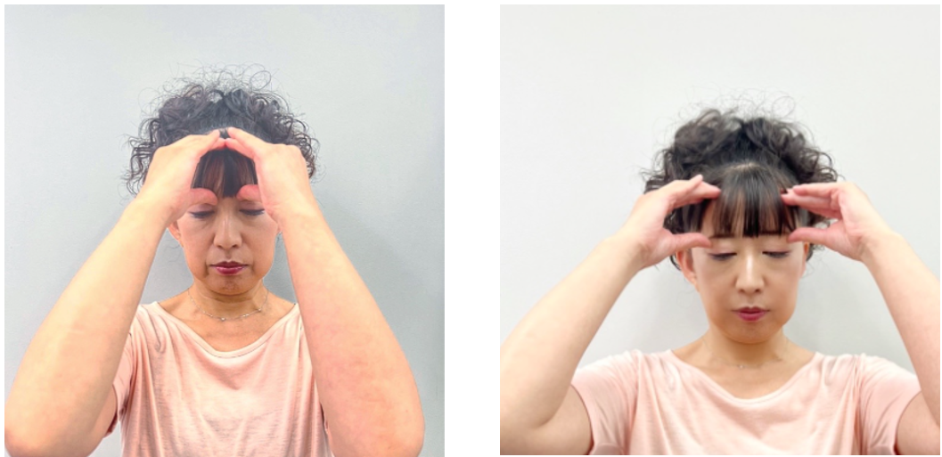 そのくぼみを外側に目じりに向かって押していく。